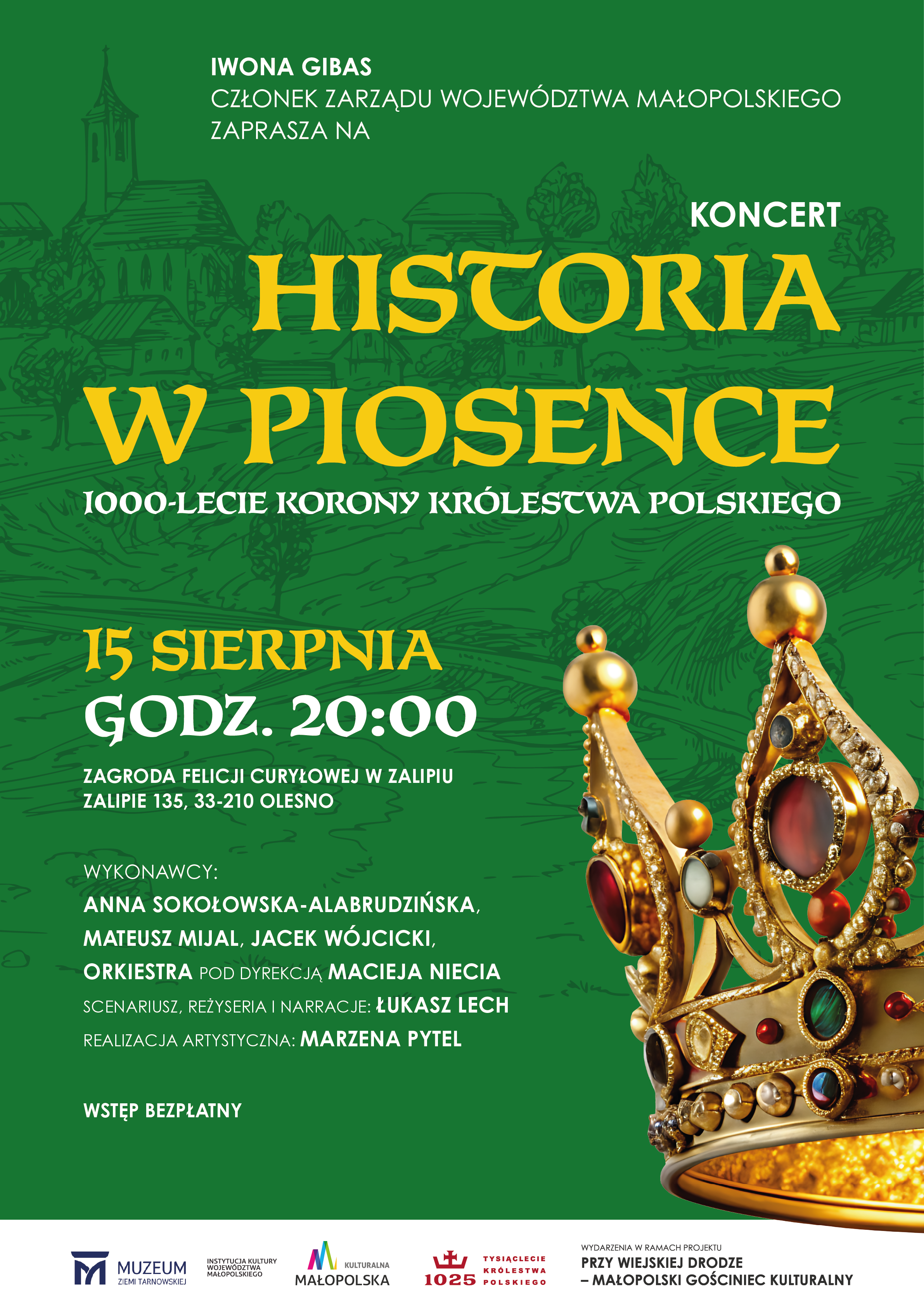 Koncert „1000-lecie Korony Królestwa Polskiego. Historia w piosence” to muzyczna podróż przez najważniejsze momenty historii Polski – od koronacji Bolesława Chrobrego w 1025 roku, aż po czasy współczesne. Wydarzenie jest częścią cyklu „Przy wiejskiej drodze – Małopolski Gościniec Kulturalny”, organizowanego przez Województwo Małopolskie.