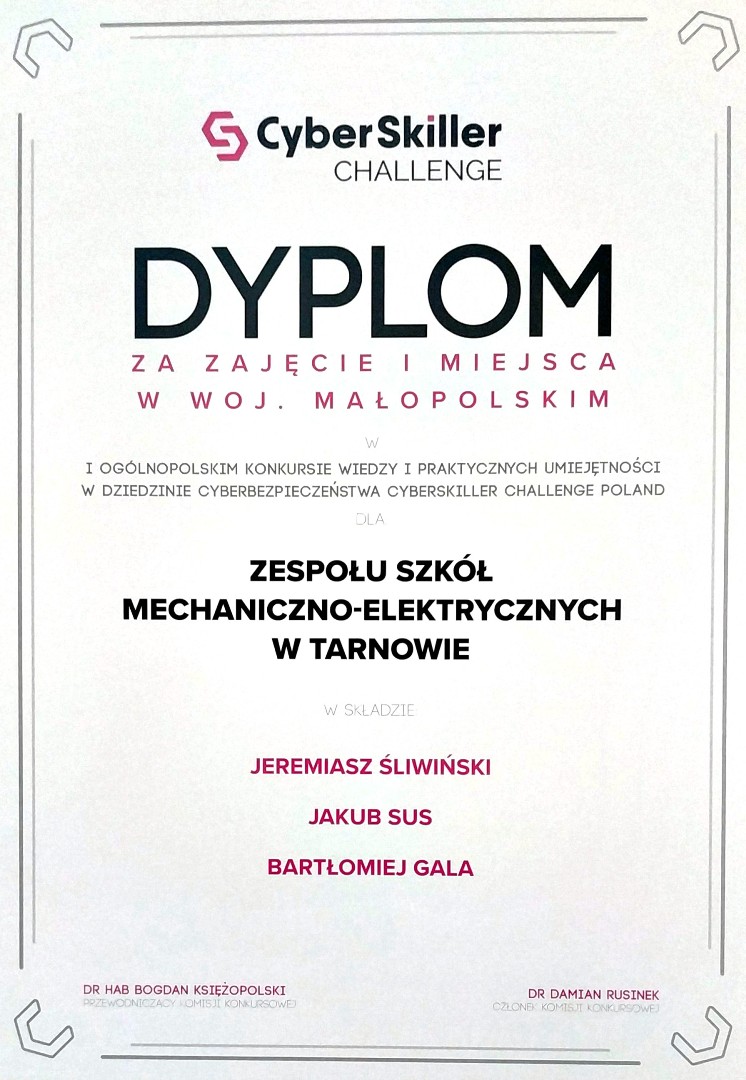 Z kolei absolwenci ZSME: Bartłomiej Gala, Jakub Sus oraz Jeremiasz Śliwiński (tegoroczni maturzyści z klasy 4IA) zajęli 5 miejsce w finale I Ogólnopolskiego Konkursu wiedzy i praktycznych umiejętności w dziedzinie cyberbezpieczeństwa: CyberSkiller Challenge Poland.