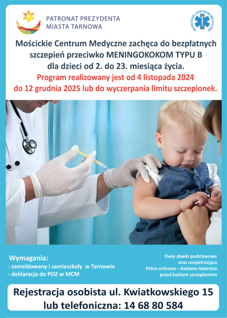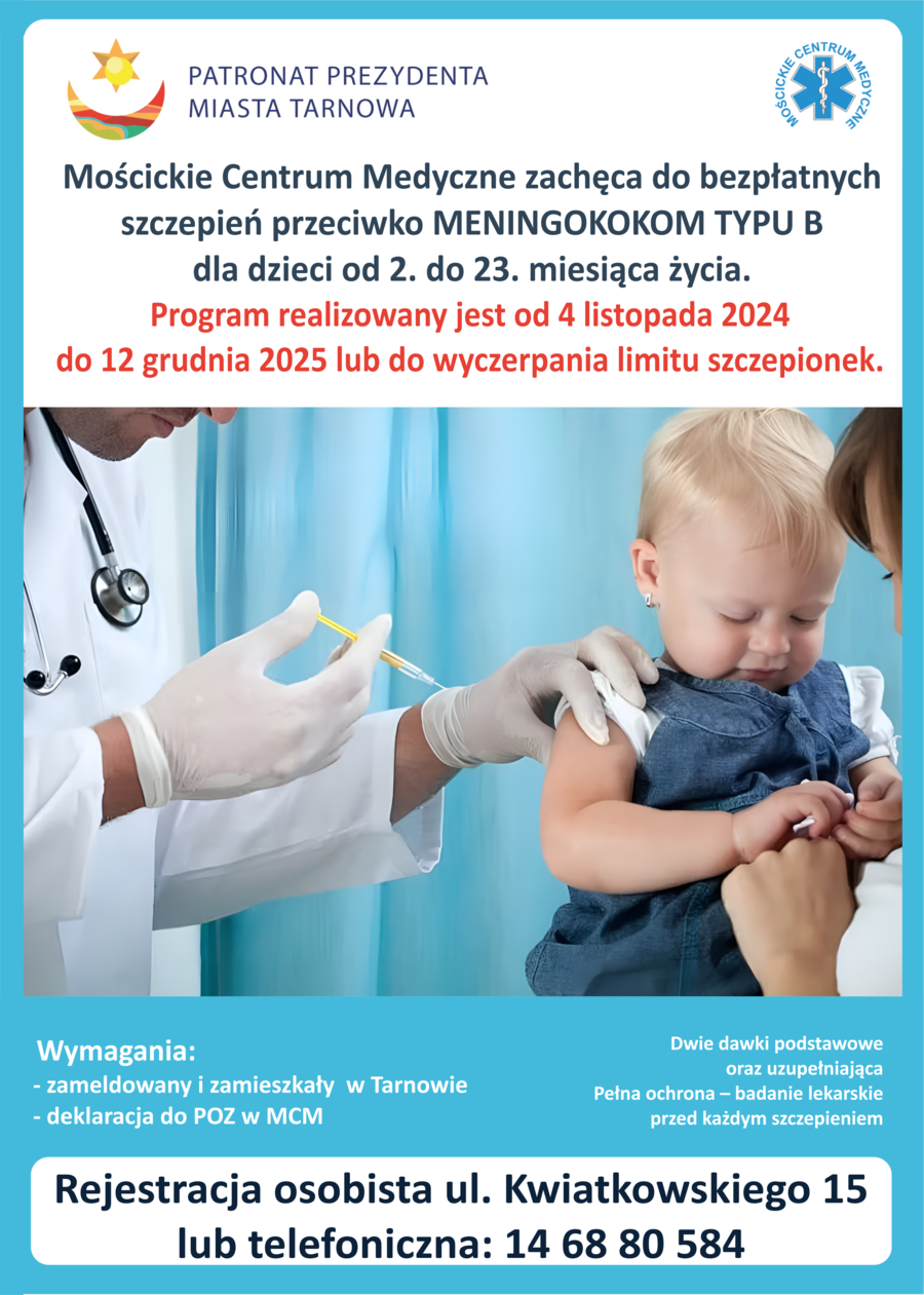 Meningokoki to bakterie, które mogą wywoływać inwazyjną chorobę (IChM) i poważne powikłania – np. niewydolność nerek, uszkodzenie słuchu czy zapalenie osierdzia. Aby temu zapobiegać, warto rozważyć szczepienie ochronne. Jest ono nierefundowane, jednak w Tarnowie można je będzie wykonać za darmo. Od 4 listopada od patronatem prezydenta Jakuba Kwaśnego w ramach Programu Profilaktyki Zakażeń Meningokokowych typu B ruszają szczepienia, które prowadzone będą także w Mościckim Centrum Medycznym. Akcja potrwa do 12 grudnia 2025 r.. Dzieci rejestrować można w Przychodni Pediatrycznej lub telefonicznie pod nr tel. 14 68 80 584.