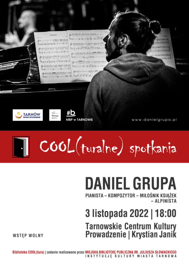 Miejska Biblioteka Publiczna im. J. Słowackiego w Tarnowie zaprasza na spotkanie z Danielem Grupą do Tarnowskiego Centrum Kultury, Rynek 5 (sala na parterze), 3 listopada 2022, godz. 18:00, który jest pierwszym gościem nowego cyklu wydarzeń „COOL(turalne) spotkania”.
