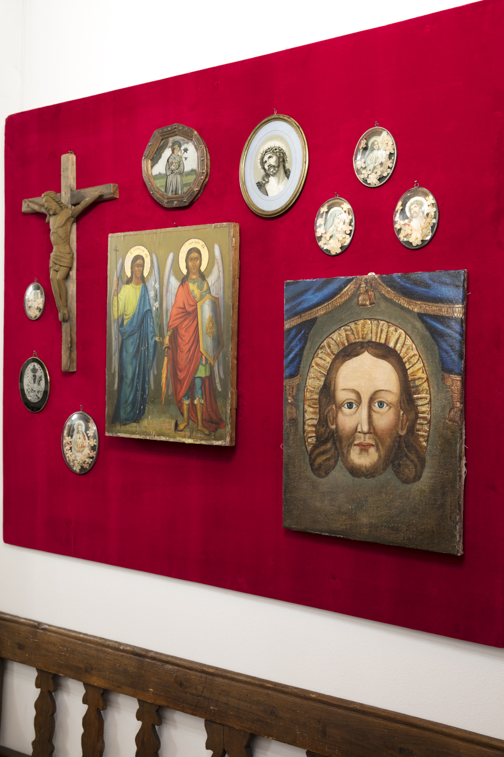 i Jezusa Chrystusa. Ciekawostką są także domowe krzyże huculskie oraz krzyże ze zgardy, czyli naszyjnika z odlewanych, mosiężnych krzyżyków, ozdoby z tradycji stroju huculskiego. Na wystawie można zobaczyć małe ikony podróżne a wśród nich prawosławną ikonę składaną, czteroskrzydłową, wielopostaciową, zdobioną w tle awersu niebieską emalią, towarzyszącą wiernym w drodze. Rzadko spotykanym obiektem jest stempel do odciskania ornamentu na cieście do wypieku prosfory (mały, okrągły chlebek pokryty prawosławną symboliką, który wierni otrzymują w postaci komunii). Zgromadzone na wystawie są także ikony typowe dla malarstwa ukraińskiego oraz współczesne ikony wykonane przez ikonopisarzy z kręgu katolickiego i greckokatolickiego (autorzy w większości pochodzą z Ukrainy i z Polski).
