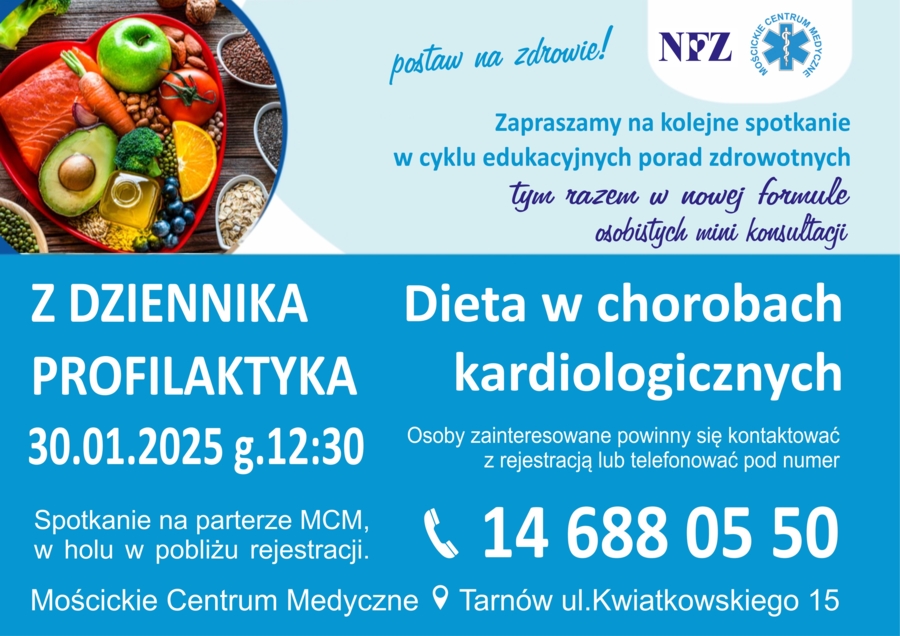 W czwartek, 30 stycznia o godzinie 12.30 w Mościckim Centrum Medycznym przy ul. Kwiatkowskiego 15 odbędzie się pierwsze w tym roku, organizowane w nowej formule, spotkanie z cyklu edukacyjnych porad zdrowotnych „Z dziennika profilaktyka”. Poświęcone ono będzie diecie w chorobach kardiologicznych.