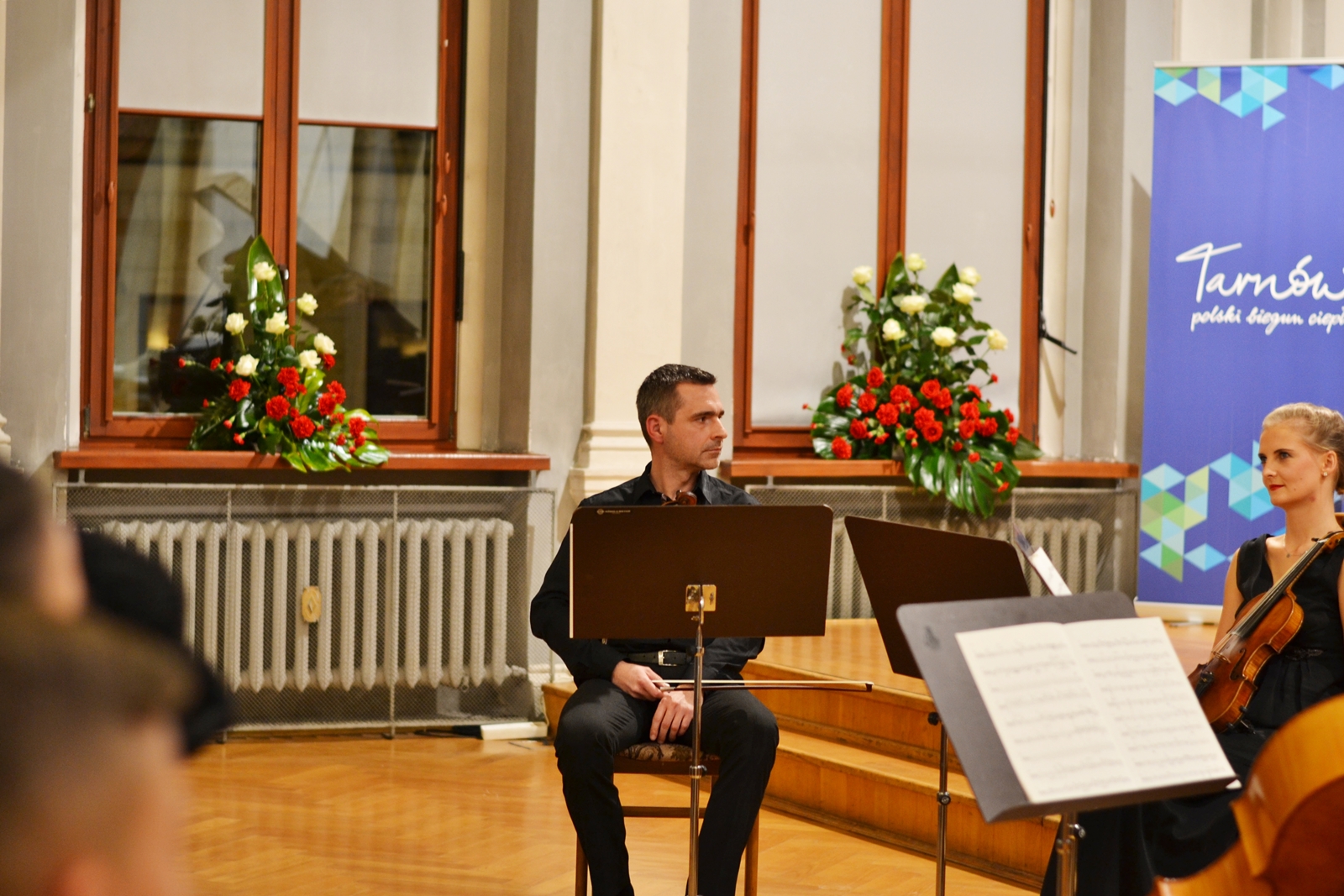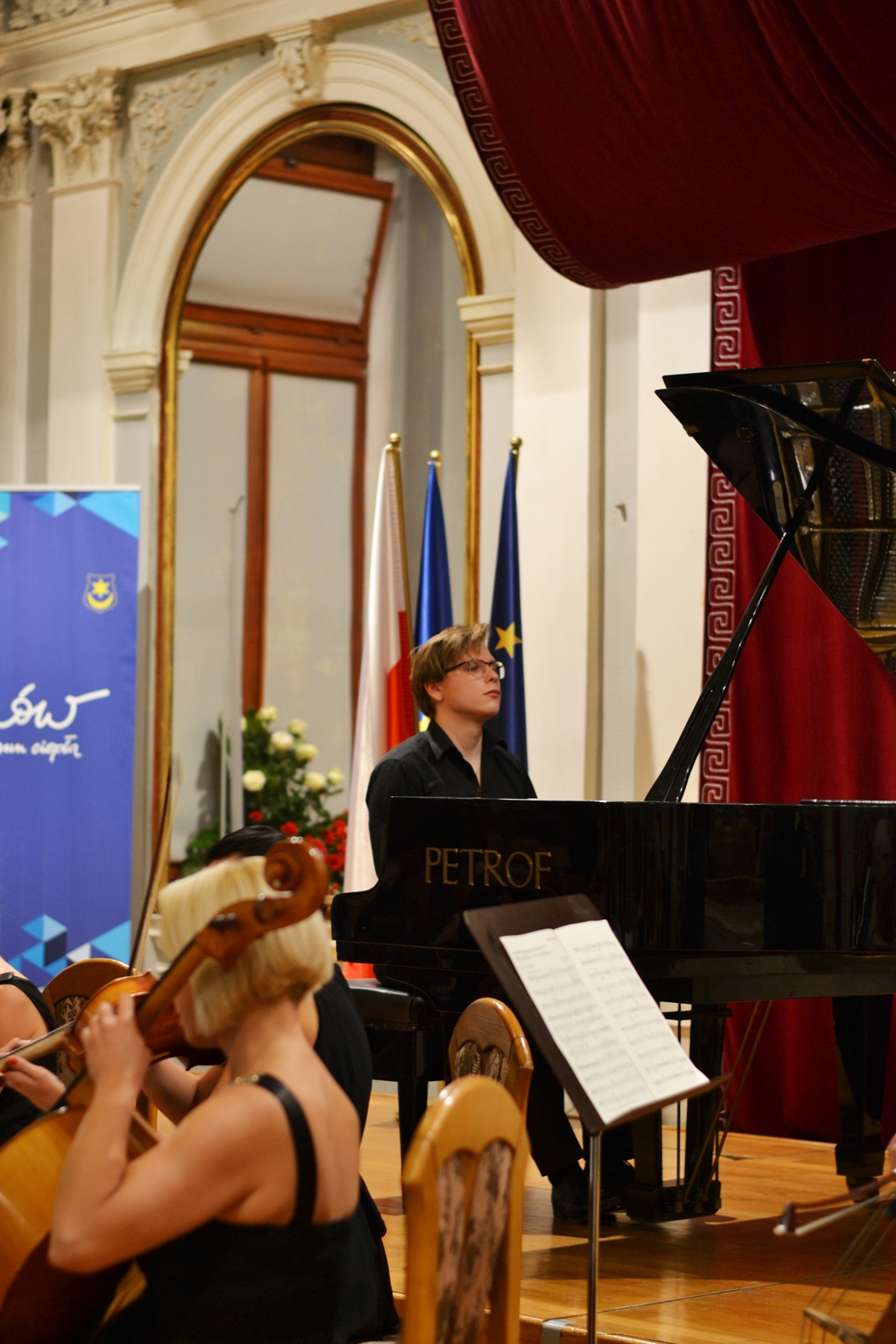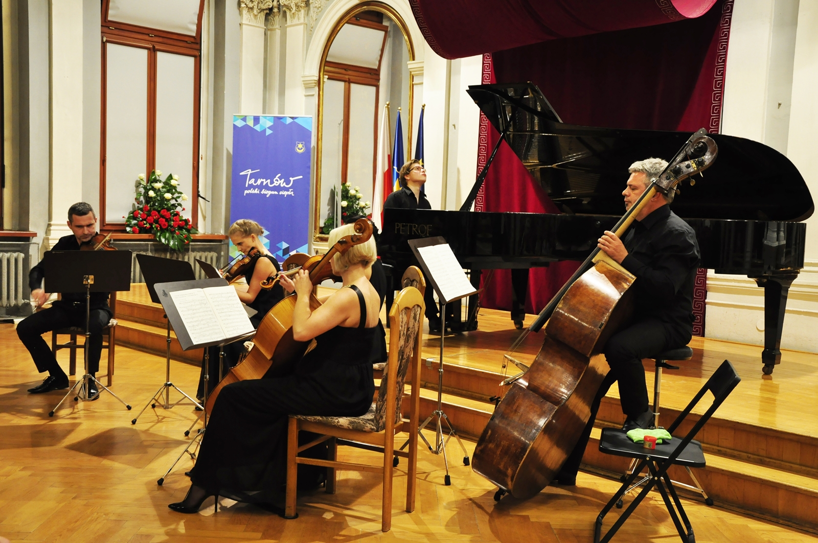 Robert Maciejowski, urodzony w Tarnowie w 1998, rozpoczął naukę gry na fortepianie w Zespole Szkół Muzycznych w Tarnowie w klasie Teresy Jarosz, mając 7 lat. Obecnie jest uczniem Ogólnokształcącej Szkoły Muzycznej II stopnia w Tarnowie pod kierunkiem profesora Mirosława Herbowskiego, laureatem zarówno krajowych, jak i międzynarodowych konkursów pianistycznych, a także stypendystą nagrodzonym między innymi przez Prezydenta Miasta Tarnowa. Brał też udział w kursach mistrzowskich pod okiem wybitnych pedagogów. W pierwszej części koncertu wykonał Etiudy op. 25 Fryderyka Chopina – drugi z cykli jego etiud, skomponowany w latach 1835-1837 i dedykowany hrabinie Marii d’Agoult, kochance węgierskiego pianisty Ferenca Liszta – oraz dzieła Ignacego Jana Paderewskiego – „Au Soir” op. 10 no 1 z „Album de Mai. Scènes romantiques pour Piano”, „Caprice (genre Scarlatti) op. 14 no 3, a także Nocturne op. 16 no 4. Ciekawostką jest, że dziewiąta etiuda Chopina, nazywana „Motylem” – grana w odpowiednim tempie – trwa zaledwie niecałą minutę. Jednym z jej najbardziej znanych wykonawców był właśnie Ignacy Jan Paderewski, choć w swoich utworach wykorzystują ją nawet muzycy jazzowi. W drugiej części koncertu młodemu artyście towarzyszył niezwykle charyzmatyczny kwintet smyczkowy, w skład którego wchodzili: Angelina Kierońska i Paweł Wajrak (skrzypce), Karolina Stasiowska (altówka), Anna Podkościelna-Cyz (wiolonczela), oraz Sławomir Ujek (kontrabas). Wspólnie zagrali dla publiczności „I koncert fortepianowy” e-moll op. 11 Fryderyka Chopina. Nie był to jednak pierwszy koncert skomponowany przez tego niezwykle utalentowanego polskiego pianistę, jak mógłby sugerować tytuł. W rzeczywistości powstał jako drugi, w roku 1830, jednak został wydany wcześniej z dedykacją dla Friedricha Kalkbrennera. Z zachowanych listów, które kompozytor pisywał do Tytusa Woyciechowskiego, wiadomo też, że powstał on pod wpływem pierwszej miłości Chopina. Utrzymany więc jest w aurze romantycznej, pełnej młodzieńczego zapału, a momenty entuzjazmu i uniesień przeplatają się w nim z chwilami spokoju i refleksji, czy nawet rozmarzenia.