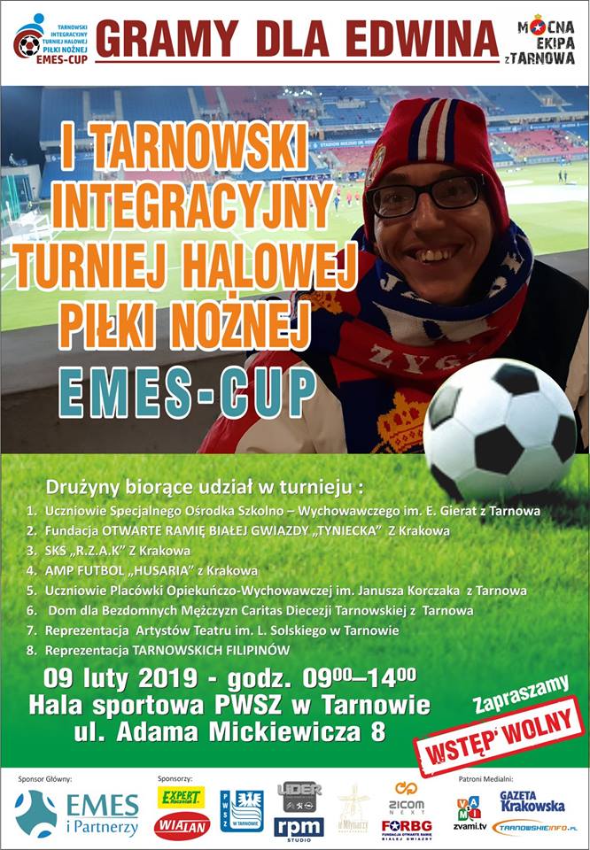 9 lutego na hali sportowej Państwowej Wyższej Szkoły Zawodowej w Tarnowie odbędzie się TARNOWSKI INTEGRACYJNY TURNIEJ HALOWEJ PIŁKI NOŻNEJ „EMES CUP – GRAMY DLA EDWINA, którego celem będzie zbudowanie wózka inwalidzkiego dla Edwina Chmury. Wstęp bezpłatny.