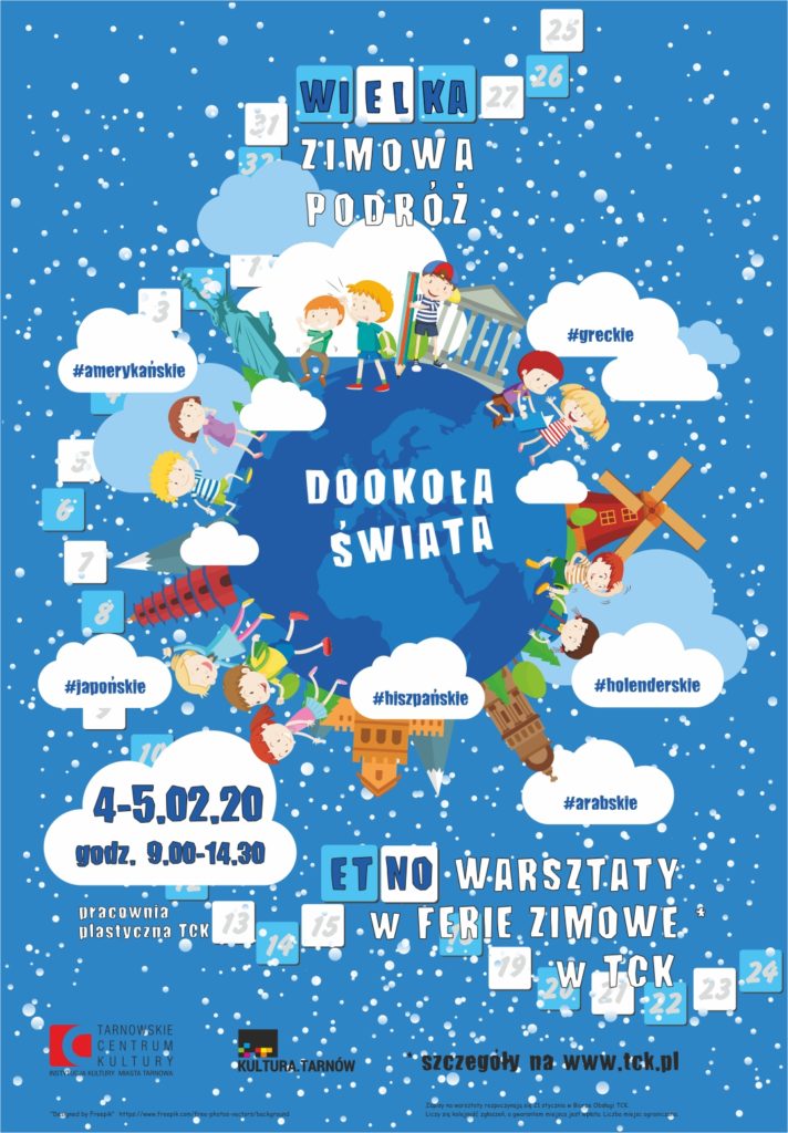 Tarnowskie Centrum Kultury zaprasza na etno warsztaty w ferie zimowe do pracowni plastycznej TCK, które odbędą się 4 i 5 lutego. WIELKA ZIMOWA PODRÓŻ DOOKOŁA ŚWIATA jest gwarantem wielu wrażeń, ciekawych odkryć, nowych smaków, nietypowych gier, wspaniałej zabawy, a przy tym sporej porcji informacji. Ponadto nikt nie wyjdzie z pustymi rękami, bo podczas warsztatów własnoręcznie wykona etnodrobiazgi. Podczas dwóch dni warsztatów Robert ROBB Maciąg, podróżnik, pedagog, autor wielu książek, podzieli się z uczestnikami swoją wiedzą i zabierze ich w podróż do bliższych i dalszych miejsc.