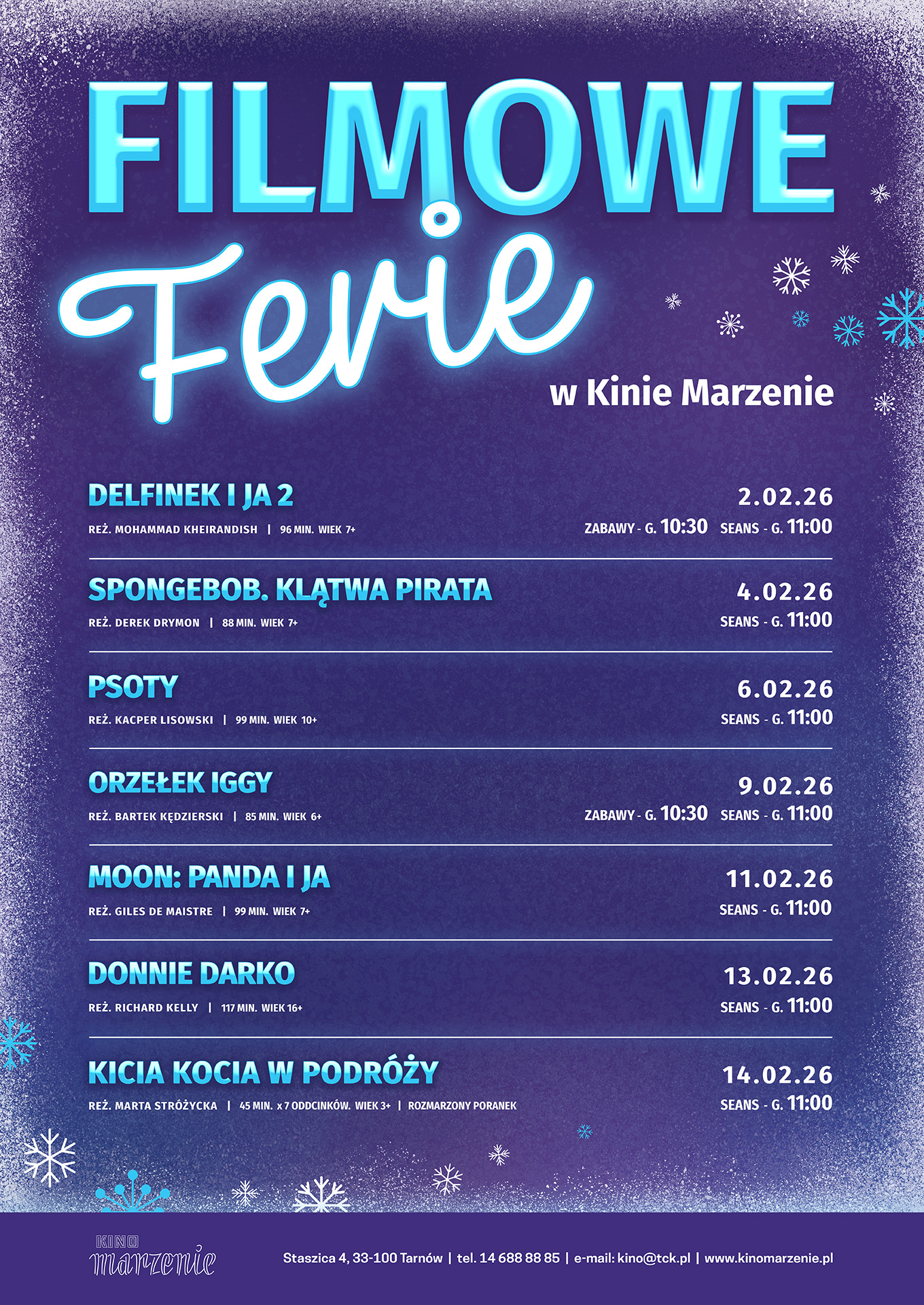 02.02. „Delfinek i ja 2”, zalecany wiek 6+, reż. Mohammad Kheirandish, czas trwania: 1h 36 min., dystrybucja Galapagos, produkcja turecka, premiera: styczeń 2026. Zabawy dla dzieci od 10:30.