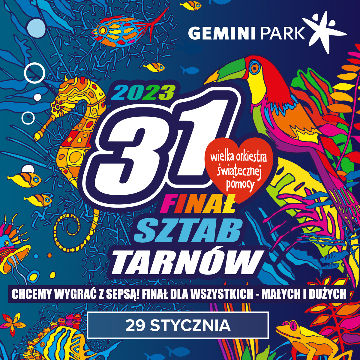 Wielka Orkiestra Świątecznej Pomocy zagra już po raz 31. W tym roku zbiórka odbędzie się pod hasłem: “Chcemy wygrać z sepsą! Gramy dla wszystkich – małych i dużych!”. W tegorocznym Finale po raz kolejny udział weźmie Gemini Park Tarnów. Już w tę niedzielę handlową, 29 stycznia, zachęcamy do odwiedzin Gemini i wzięcia udziału w wydarzeniach odbywających się na terenie centrum handlowego, a także do licytacji w internetowych aukcjach, z których dochód jest przeznaczony na rzecz Wielkiej Orkiestry Świątecznej Pomocy.