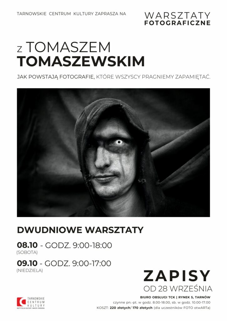 Warsztaty fotograficzne z Tomaszem Tomaszewskim „Jak powstają fotografie, które wszyscy pragniemy zapamiętać.” odbędą się w dniach 8-9 października 2022 r., w pracowni fotograficznej otwARTa Tarnowskiego Centrum Kultury. Zapisy rozpoczęły się 28 września i tego samego dnia całą lista uczestników została zapełniona.