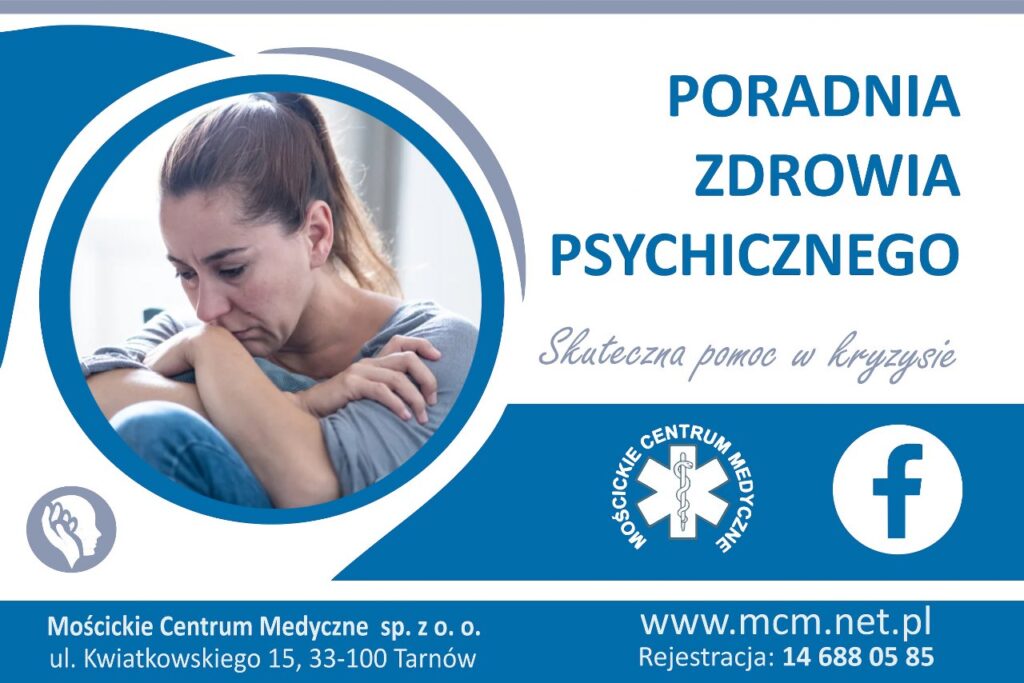 Gdy lęk uniemożliwia normalne funkcjonowanie i pojawia się silna depresja, myśli samobójcze albo samookaleczenia – nie wolno zwlekać i warto skorzystać z pomocy specjalisty. Można to zrobić w Poradni Zdrowia Psychicznego Mościckiego Centrum Medycznego. Oferuje ona świadczenia z obszaru psychiatrii, obejmujące diagnostykę i leczenie zaburzeń psychicznych u osób dorosłych. Są one udzielane w ramach wizyt komercyjnych oraz w ramach umów zawartych z prywatnymi ubezpieczycielami.