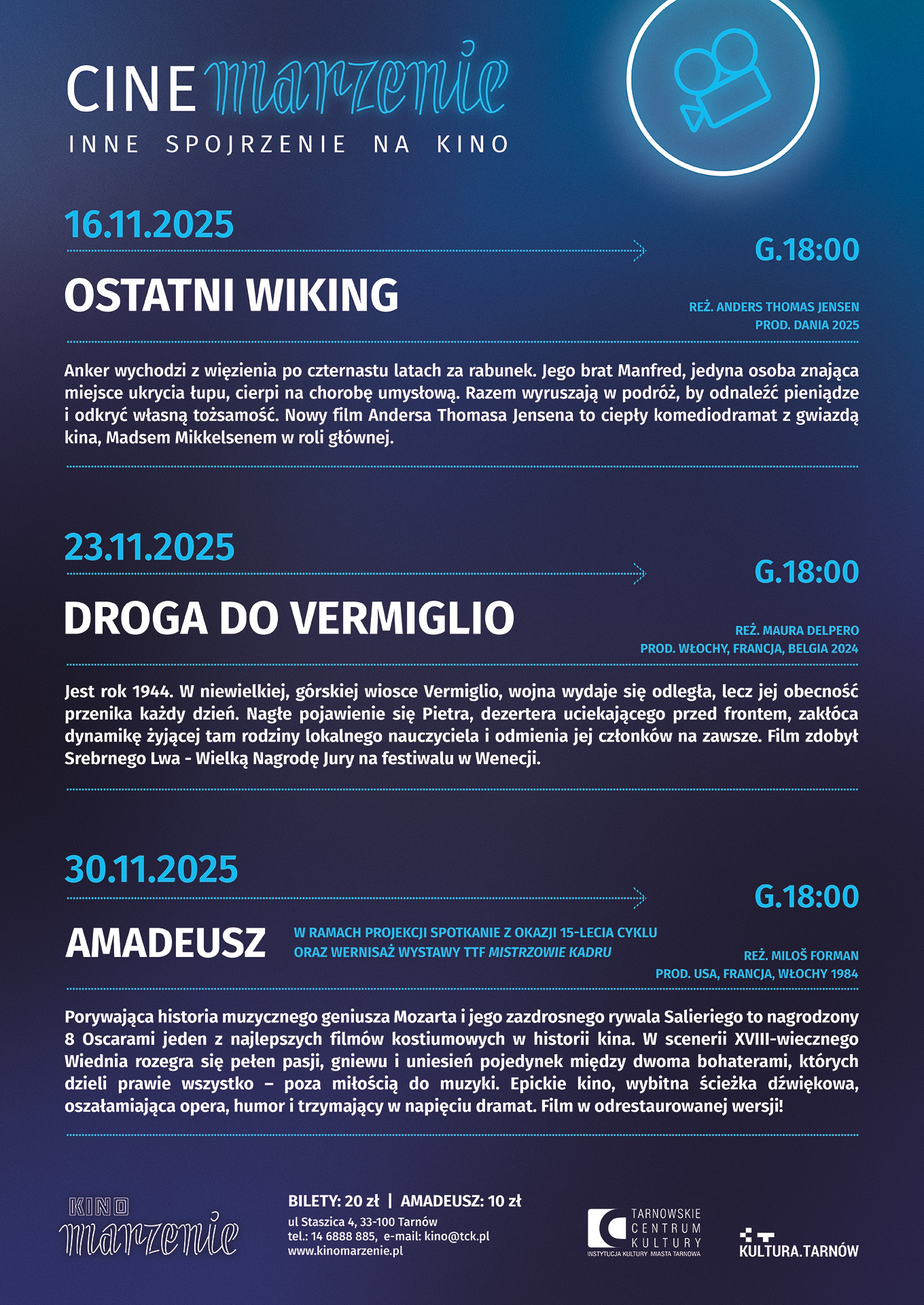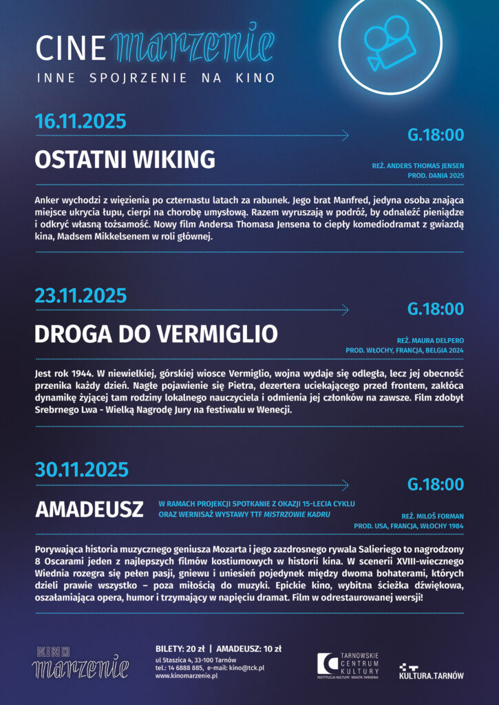 Z okazji jubileuszu zapraszamy na wieczór pełen wrażeń. W programie znalazł się seans nagrodzonego ośmioma Oscarami filmu „Amadeusz” w reżyserii Miloša Formana – jednej z najbardziej cenionych biografii w historii kina, opowiadającej o geniuszu i tragizmie Wolfganga Amadeusza Mozarta. Po projekcji odbędzie się spotkanie z filmoznawcami, krytykami, edukatorami- Dianą Dąbrowską, Kają Łuczyńską oraz Sebastianem Smolińskim. Uroczystość uświetni wernisaż wystawy fotograficznej „Mistrzowie kadru”, prezentującej prace członków Tarnowskiego Towarzystwa Fotograficznego, poświęcone wybranym twórcom filmowego obrazu. Jubileuszowy wieczór w kinie Marzenie będzie nie tylko podróżą przez historię „Cinemarzenia”, lecz także świętem dla wszystkich, którzy kochają kino w jego najlepszym wydaniu.