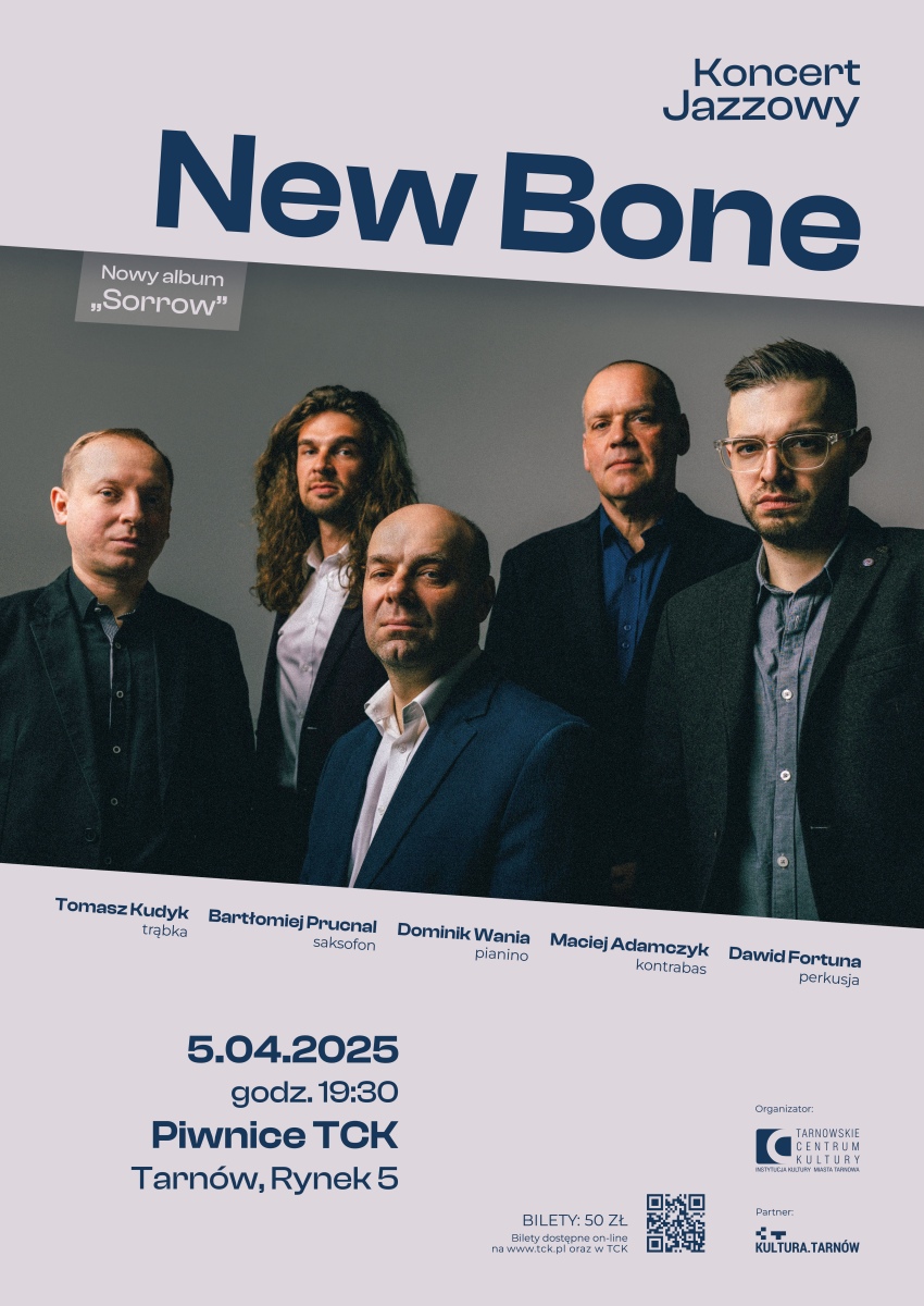 Już w kwietniu Tarnów będzie miał zaszczyt gościć jeden z najbardziej cenionych polskich zespołów jazzowych – New Bone. Formacja zaprezentuje materiał z najnowszej płyty zatytułowanej „Sorrow”, której premiera miała miejsce 21 marca br. To wyjątkowa okazja, aby usłyszeć premierowe kompozycje na żywo w kameralnej przestrzeni Piwnic TCK. Koncert z pewnością zachwyci zarówno miłośników jazzu, jak i tych, którzy dopiero odkrywają ten gatunek muzyczny.