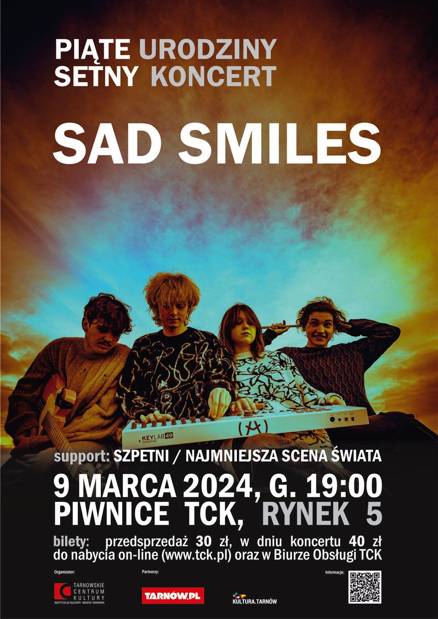 Ten zespół ma wszystko: pasję, charyzmatycznego wokalistę, urocze chórki i młodzieńczy, ale bardzo już dojrzały, bunt. “Gówniarze” – pomyślelibyście. A i tekstów, i grania mogą pozazdrościć niejedni, którzy występują od dekad. – tak pisze o zespole Sad Smiles Oliwia Kopcik w portalu Muzyka Interia.pl. Tarnowskie Centrum Kultury zaprasza wiec na wyjątkowy koncert już 9 marca o godzinie 19.00 w Piwnicach TCK-u.