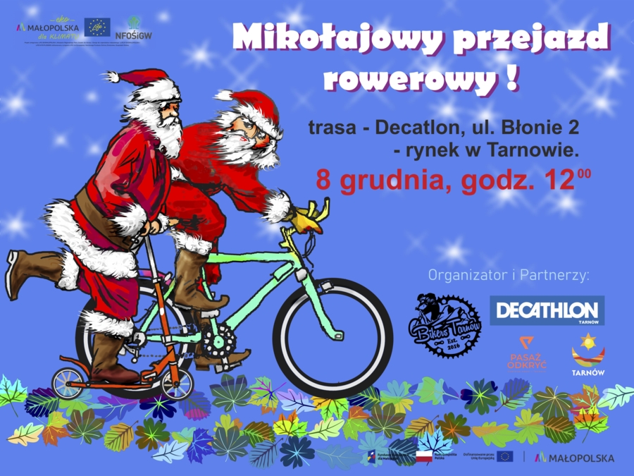 Fani dwóch kółek będą mogli wziąć udział w Mikołajkowym Przejeździe Rowerowym, który wystartuje w niedzielę, 8 grudnia o godzinie 12.00, z parkingu pod sklepem Decathlon (ul. Błonie 2). Finał trasy zaplanowano na tarnowskim rynku. Na Przejazd nie ma zapisów, uczestnictwo jest bezpłatne.