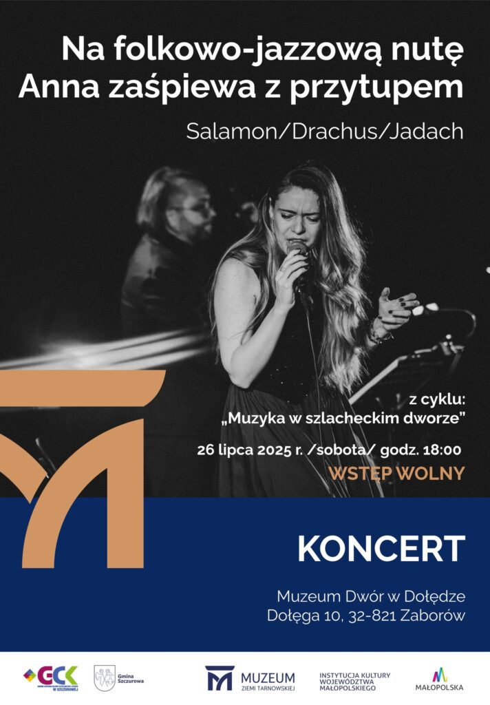 26 lipca 2025 o godz. 18:00 odbędzie się koncert „Na folkowo jazzową nutę Anna zaśpiewa z przytupem”. Usłyszycie jazzowe ballady, a także folkowe przyśpiewki z Podkarpacia, bluesowe brzmienia i taneczną bossę novę, wszystko wzbogacone poezją Osieckiej i Czechowicza.