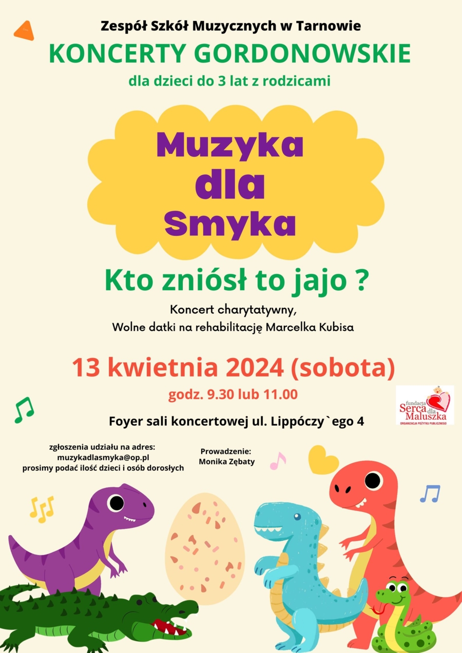 Koncerty „Muzyka dla smyka – Kto zniósł to jajo?” poprowadzi jak zwykle Monika Zębaty. Będą one miały charakter charytatywny, zbierane będą podczas nich wolne datki na rehabilitację Marcelka Kubisa. Koncerty gordonowskie dedykowane są najmłodszym dzieciom. Oparte na teorii uczenia się muzyki profesora Edwina Eliasa Gordona pełnią funkcję umuzykalniającą, pozwalają wejść w świat muzyki. Towarzyszy temu dobra zabawa dla całej rodziny. Do delikatnych uszu dzieci dostosowane jest także niewielkie nagłośnienie.