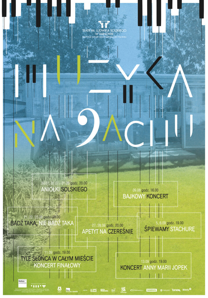 W 2018 roku zakończyła się modernizacja budynku zaplecza technicznego teatru, na dachu którego wybudowano wielki taras, pokryty prawdziwą trawą z ogrodem zimowym, przeznaczony na prezentację spektakli w plenerze, pod gołym niebem. Do tego właśnie miejsca zapraszamy Państwa na wspólne spędzenie letnich wieczorów. Zaprezentujemy „Aniołki Solskiego” podczas których to widzowie tworzą program, zamawiając poszczególne utwory ze specjalnego menu; „Bajkowy koncert” składający się z niezwykle urokliwych, piosenek dla dzieci i nie tylko; spektakl „Bądź taka, nie bądź taka” z aranżacjami największych przebojów Kory i Zespołu Maanam; spektakl muzyczny Agnieszki Osieckiej „Apetyt na czereśnie” z finezyjnymi i dowcipnymi dialogami o spotkaniu kobiety i mężczyzny; koncert utworów z repertuaru Edwarda Stachury pn. „Śpiewamy Stachurę” oraz finałowy koncert na zakończenie warsztatów muzycznych „Tyle słońca w całym mieście” z udziałem chóru Solskiego. Ostatnim wydarzeniem w ramach projektu „Muzyka na dachu” będzie koncert Anny Marii Jopek z zespołem, który odbędzie się na Dużej Scenie.