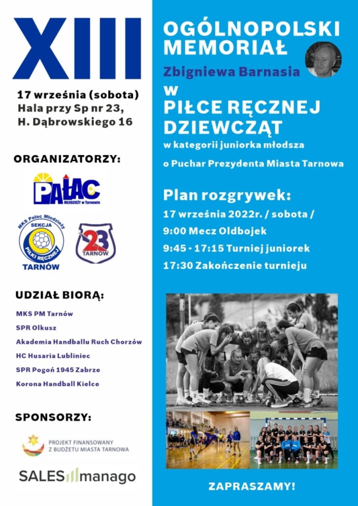 W sobotę, 17 września w hali Szkoły Podstawowej nr 23 w Tarnowie, zostanie rozegrany XIII Ogólnopolski Memoriał Zbigniewa Barnasia w piłce ręcznej juniorek młodszych o Puchar Prezydenta Miasta Tarnowa. Zawody rozpocznie o godzinie 9.00 mecz oldbojek.