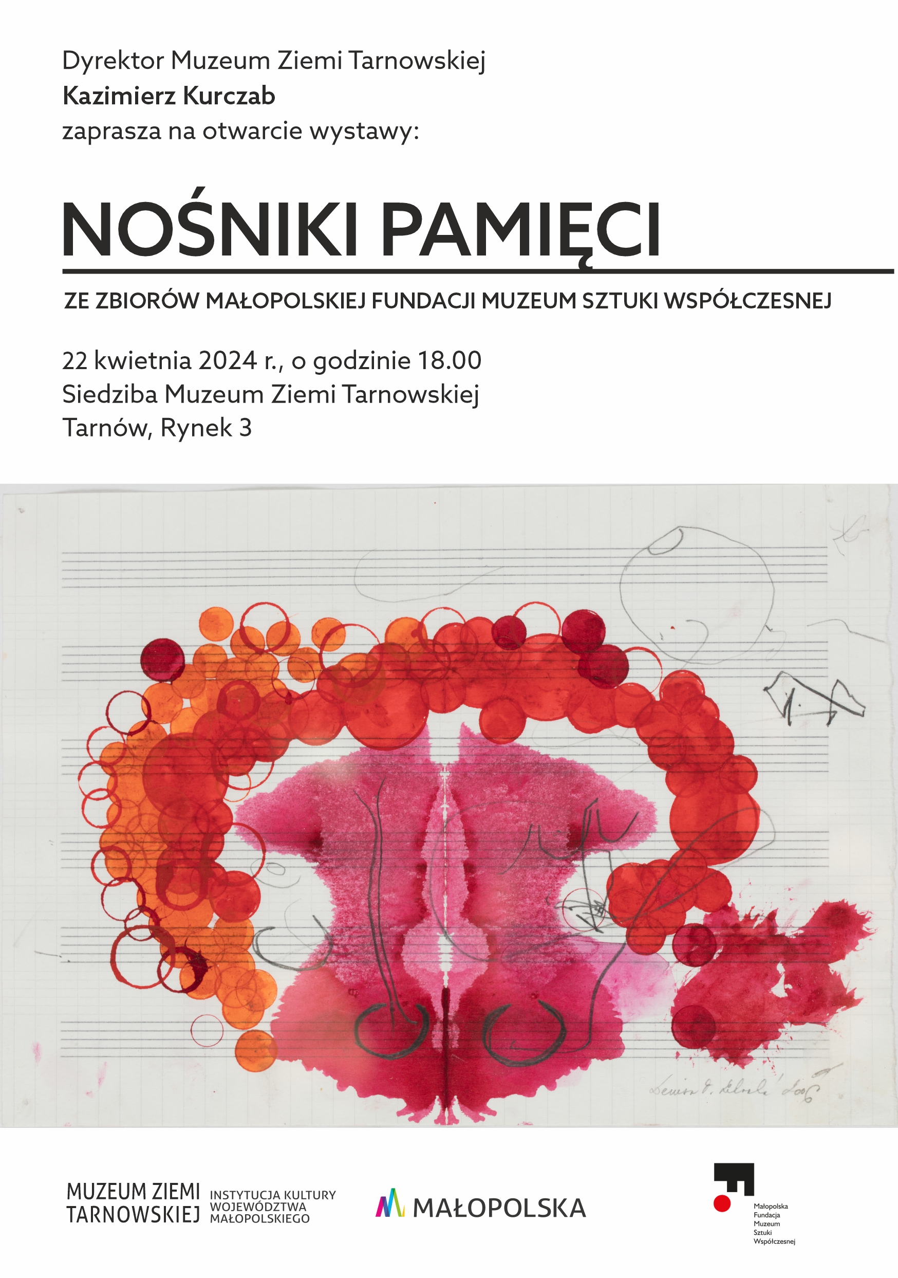 22.04.2024 roku o godzinie 18.00 w Siedzibie Muzeum Ziemi Tarnowskiej, Rynek 3, odbędzie się otwarcie wystawy: „Nośniki Pamięci”, na której zaprezentowane zostaną obiekty ze zbiorów Małopolskiej Fundacji Muzeum Sztuki Współczesnej.