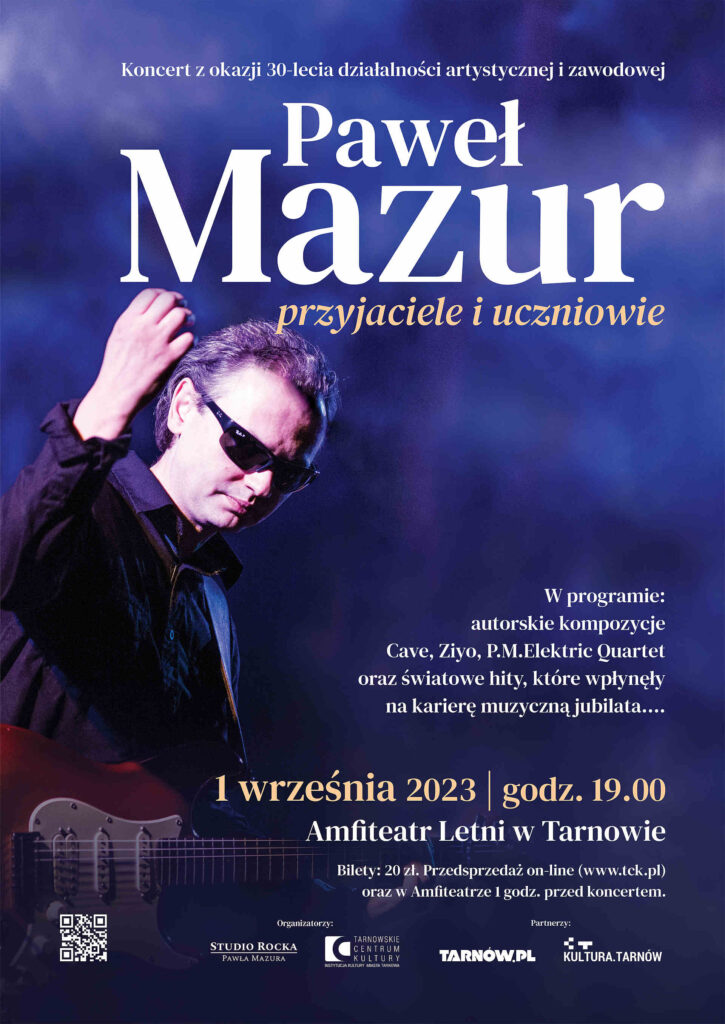 Tarnowskie Centrum Kultury zaprasza 1 września o godzinie 19.00 do Amfiteatru Letniego na wspólne świętowanie jubileuszu 30-lecia pracy artystycznej i zawodowej tarnowskiego wybitnego muzyka Pawła Mazura.