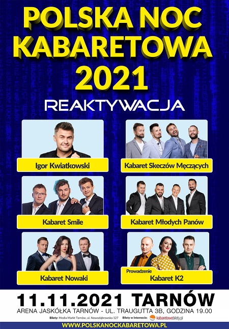 Już za niespełna miesiąc, a dokładnie 11 listopada br. w tarnowskiej Arenie Jaskółka, przy ul. Traugutta 3B o godzinie 19.00 odbędzie się Polska Noc Kabaretowa 2021 Reaktywacja. W wydarzeniu wystąpią najzabawniejsze formacje kabaretowe. Pojawią się: Nowaki, Kabaret Młodych Pansów, K2, Smile, Kabaret Skeczów Męczących oraz Igor Kwiatkowski.
