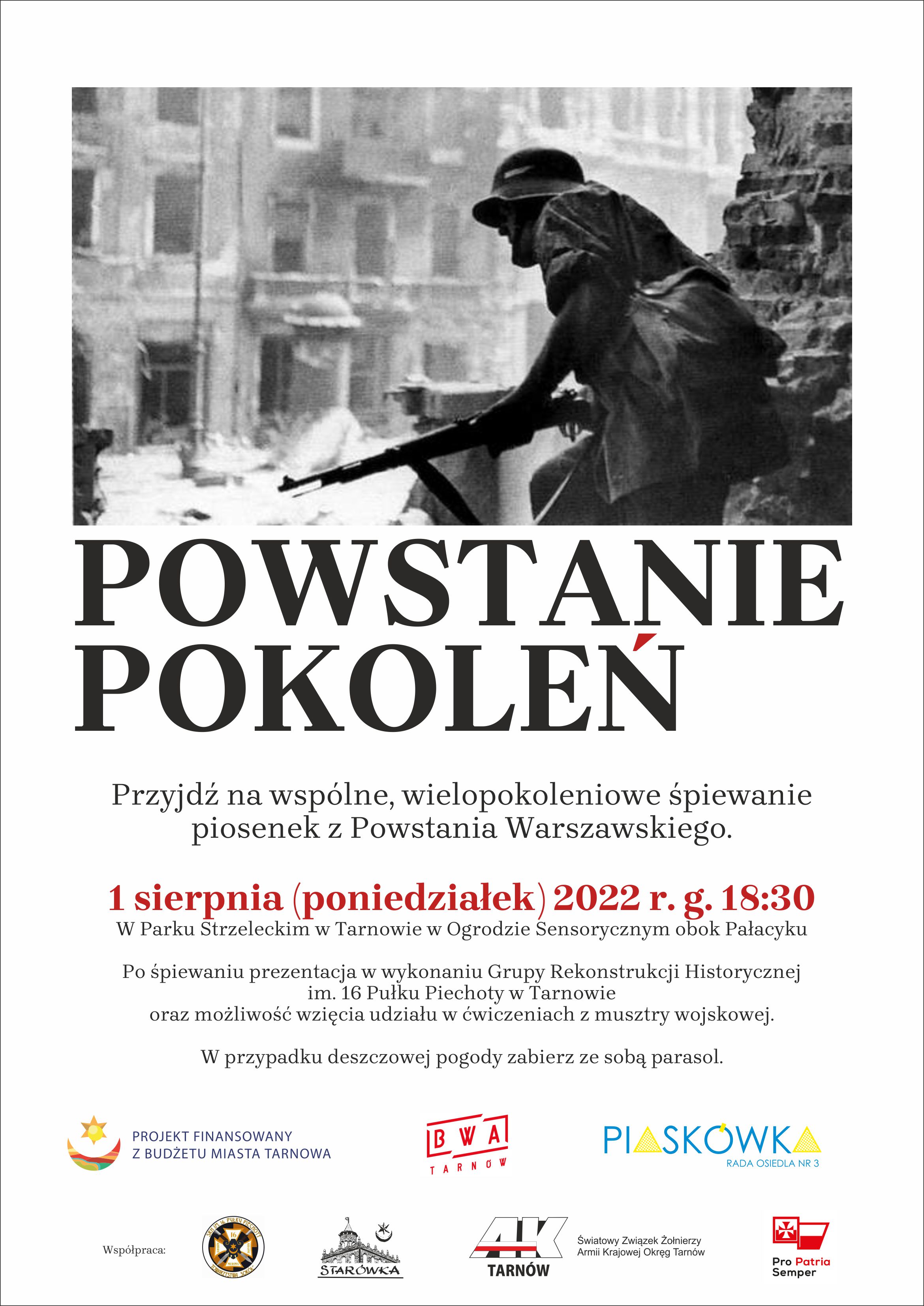 Rada Osiedla Piaskówka oraz Biuro Wystaw Artystycznych w Tarnowie zapraszają 1 sierpnia o godzinie 18.30 na „Powstanie Pokoleń”, czyli wspólne śpiewanie w 78. rocznicę wybuchu Powstania Warszawskiego, które odbędzie się w Ogrodzie Sensoryczny w Parku Strzeleckim, ul. Słowackiego 1. Wstęp wolny.
