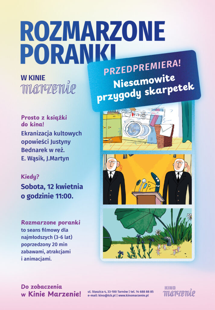 Kino Marzenie zaprasza na Rozmarzony poranek 12 kwietnia o godz. 11:00. Na ekranie, przedpremierowo, „Niesamowite przygody skarpetek” według bestsellerowej książki Justyny Bednarek! Poznaj świat w którym każda skarpetka może zostać, kim tylko chce – mysią mamą, duchem, a nawet prezydentką. Te skarpetki wcale nie są zagubione – one po prostu same decydują o swojej drodze. Podejmują odważne decyzje i przede wszystkim uczą młodych widzów, że warto wierzyć w siebie i spełniać marzenia. Przed seansem zapraszamy najmłodszych na kreatywne zabawy!