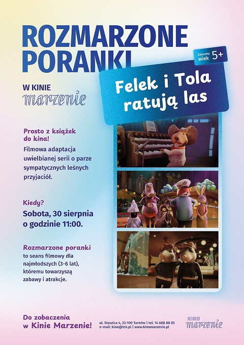Zapraszamy najmłodszych do kina Marzenie na spotkanie z cyklu Rozmarzone poranki. Sobotnie przedpołudnie 30 sierpnia, (godz. 11:00) spędzimy wspólnie, bawiąc się w przestrzeni kina (około 20 minut), a na dużym ekranie obejrzymy animację „Felek i Tola ratują las”, reż. Mascha Halbertstad. Animacja opowiada o przygodzie leśnych, zabawnych zwierząt, ujęte w uniwersalną historię, którą można przełożyć na życie codzienne małego widza. Chociaż film trwa niewiele ponad godzinę poruszono w nim sporo istotnych tematów, które są ważne dla ludzi: dbanie o wspólne dobro, egoizm i jak sobie z nim radzić, współpracę, lojalność i prawdziwą przyjaźń. Film posiada znak jakości Zespołu Edukatorów Filmowych.