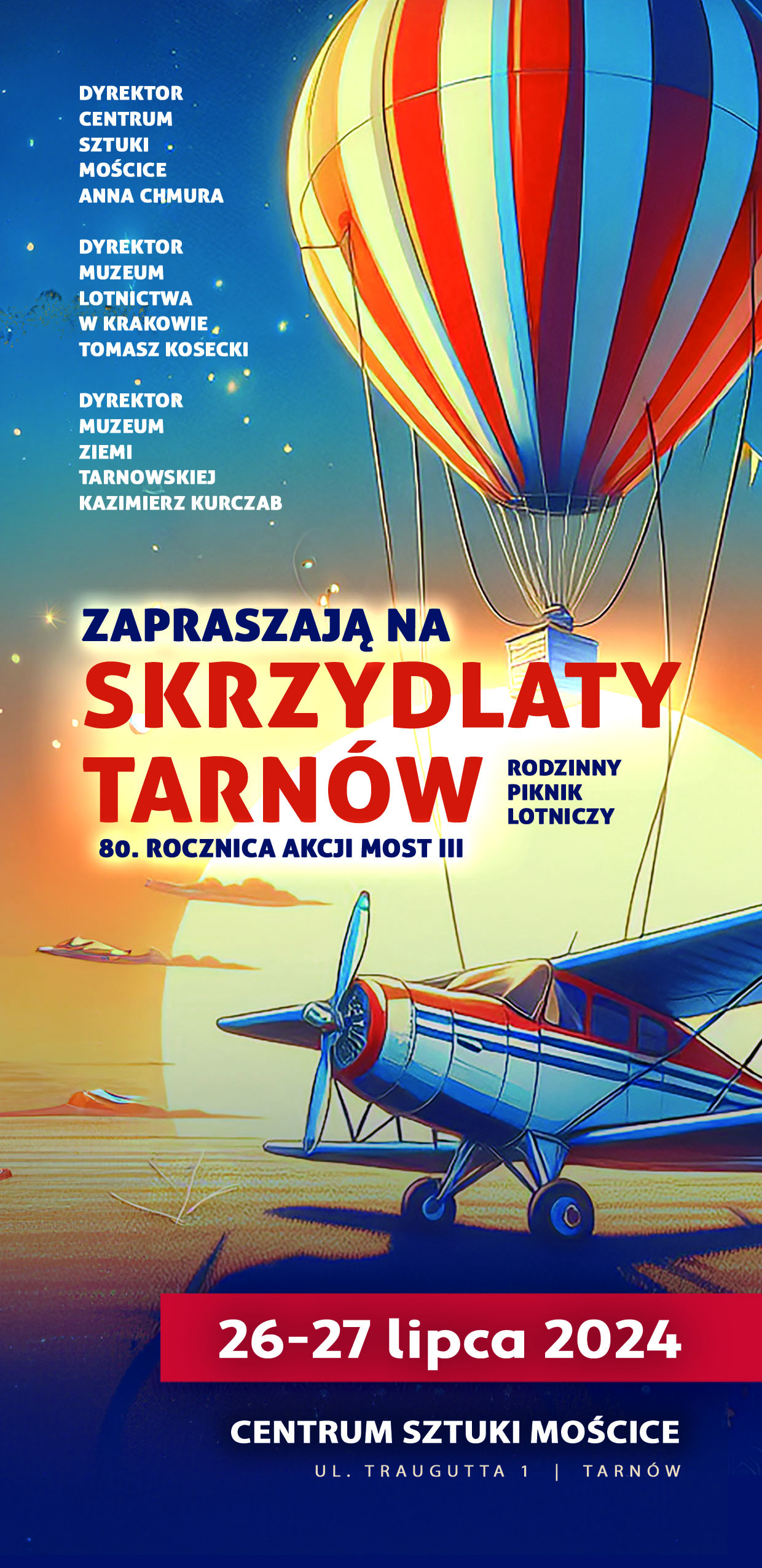 W dniach 26 i 27 lipca 2024 r. na terenach Centrum Sztuki Mościce odbędzie się wydarzenie pn.: „Skrzydlaty Tarnów”, którego organizatorami są instytucje kultury Województwa Małopolskiego: Centrum Sztuki Mościce, Muzeum Ziemi Tarnowskiej oraz Muzeum Lotnictwa Polskiego w Krakowie. W programie imprezy m.in. otwarcie wystawy, prelekcje, nocny start balonu, a w czasie pikniku: rodzinna strefa aktywności, pokazowy przelot samolotów, strzelnica, kino plenerowe i wiele więcej.