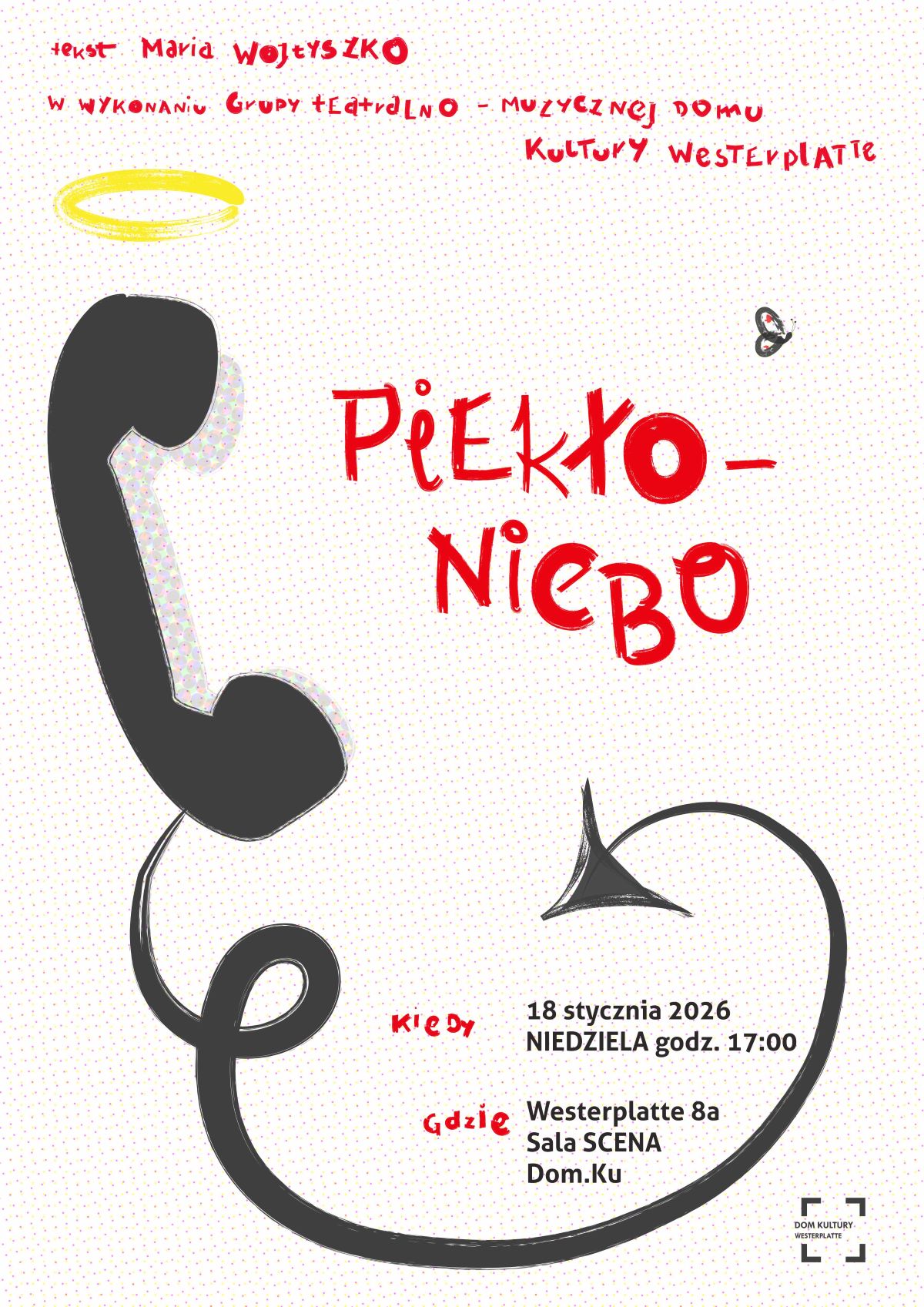 Spektakl w wykonaniu młodzieżowej grupy teatralnej Dom.Ku to spektakl o miłości i przemianach, które musimy zaakceptować, ale także o kobiecej sile, buncie i niezgodzie na to, co narzuca nam los. Główna bohaterka trafia do nieba, jednak szybko dochodzi do wniosku, że jej czas jeszcze się nie skończył. Za wszelką cenę próbuje wrócić do swojego syna. Podczas ucieczki z zaświatów spotyka diabła marzącego o byciu człowiekiem, archanioła, który kiedyś nim był, oraz własnego ojca — będącego tylko „połową człowieka”… Piekło – Niebo nie jest sztuką wyjaśniającą, co dzieje się z człowiekiem po śmierci, bo skupia się na życiu: jak rozwiązywać sytuacje bez wyjścia i naprawiać życiowe błędy, w jaki sposób oswajać myśl o odejściu bliskiego; że warto łamać stereotypy i zawierać nieszablonowe przyjaźnie, a wszystko to bez najmniejszej kropli zbyt oczywistego sentymentalizmu.