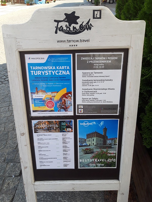 Spacerki po Tarnowie rozpoczynają się codziennie w samo południe sprzed budynku Tarnowskiego Centrum Informacji przy Rynku 7. Jakże łatwo go przegapić, kiedy tuż przed wejściem znajdują się rozłożone parasole, zasłaniające widok na drzwi. Na całe szczęście, tuż przy brukowanej drodze znajduje się poniższa tabliczka. To ona stanowi pierwszą wskazówką dla chętnych atrakcji turystów. To jednak nie powinno nikogo zniechęcać.