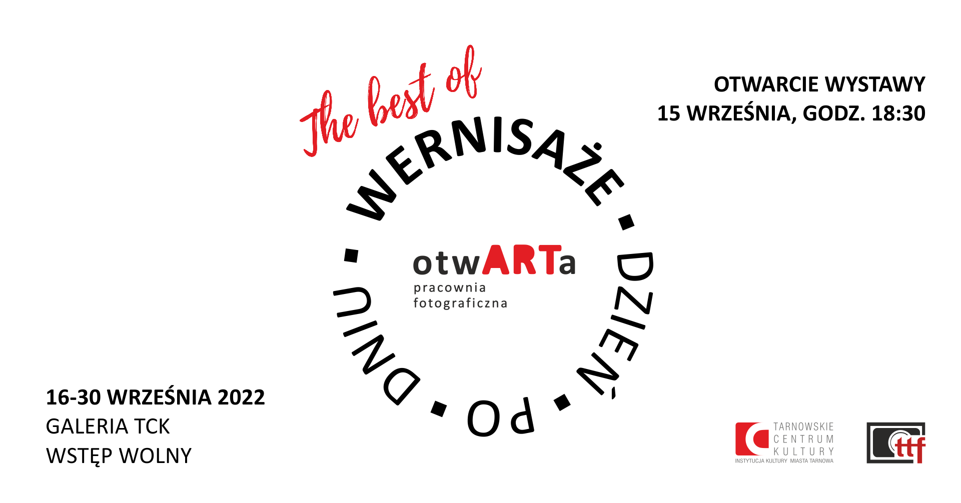 Ekspozycja The best of „Wernisaże dzień po dniu” będzie składała się z dwóch fotografii każdego z wyżej wymienionych autorów i zostanie uzupełniona pracami zapowiadającymi kolejną odsłonę cyklu. Na otwarcie wystawy z udziałem autorów zapraszamy 15 września 2022 r. o godz. 18:30 do Galerii TCK. Ekspozycja będzie dostępna od 16 do 30 września 2022 r. (w dni powszednie od 10:00 do 18:00, w soboty od 10:00 do 17:00). Wstęp wolny!