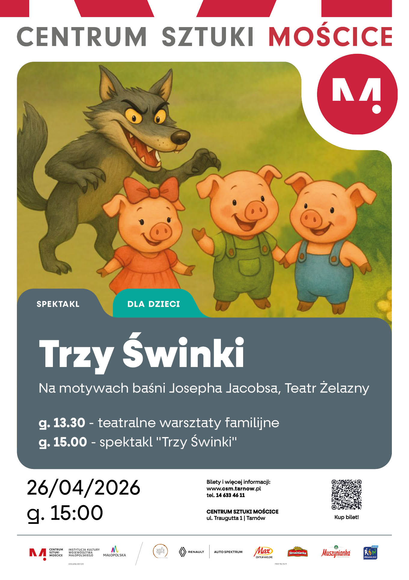 „Trzy Świnki” to pełna humoru i energii adaptacja klasycznej bajki, która wprowadzi dzieci i dorosłych w świat wspaniałej zabawy! W tej teatralnej wersji, znane postaci – trzy sprytne świnki – przeżywają niecodzienne przygody, a ich zmagania z groźnym wilkiem pełne są śmiechu, niespodzianek i muzyki! Centrum Sztuki Mościce zaprasza 26 kwietnia do sali widowiskowej o godzinie 15.00.