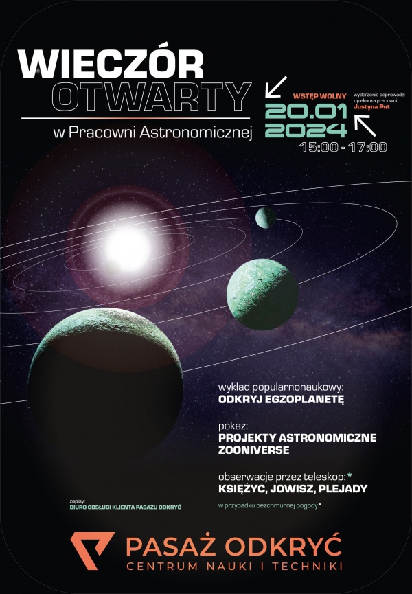 Pasaż Odkryć w Tarnowie zaprasza w sobotę, 20 stycznia w godzinach od 15.00-17.00 na wieczór otwarty w Pracowni Astronomicznej. Wstęp bezpłatny. Zapisy prowadzi Biurze Obsługi Klienta Pasażu Odkryć, Rynek 4, Tarnów, lub pod numerem 14 688 88 86.