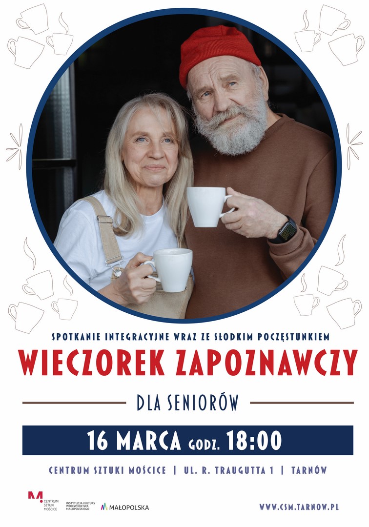 W środę, 16 marca o godzinie 18.00 w Centrum Sztuki Mościce odbędzie się spotkanie integracyjne wraz ze słodkim poczęstunkiem pod tytułem “Wieczorek zapoznawczy dla Seniorów”.