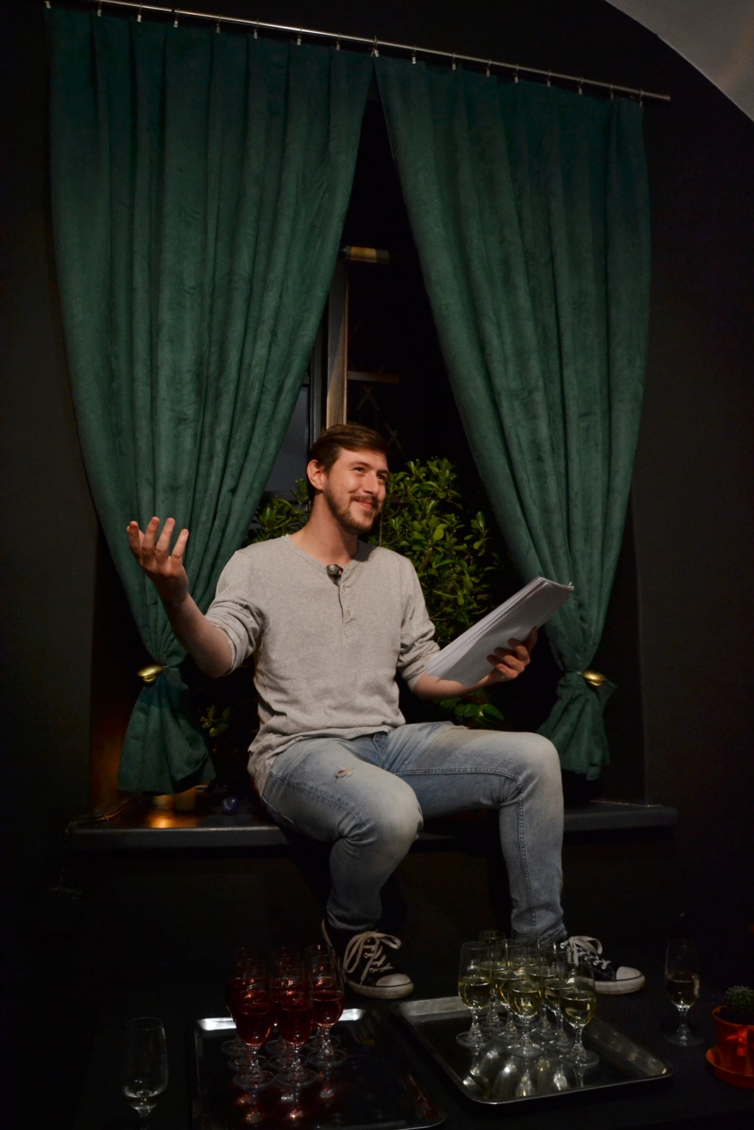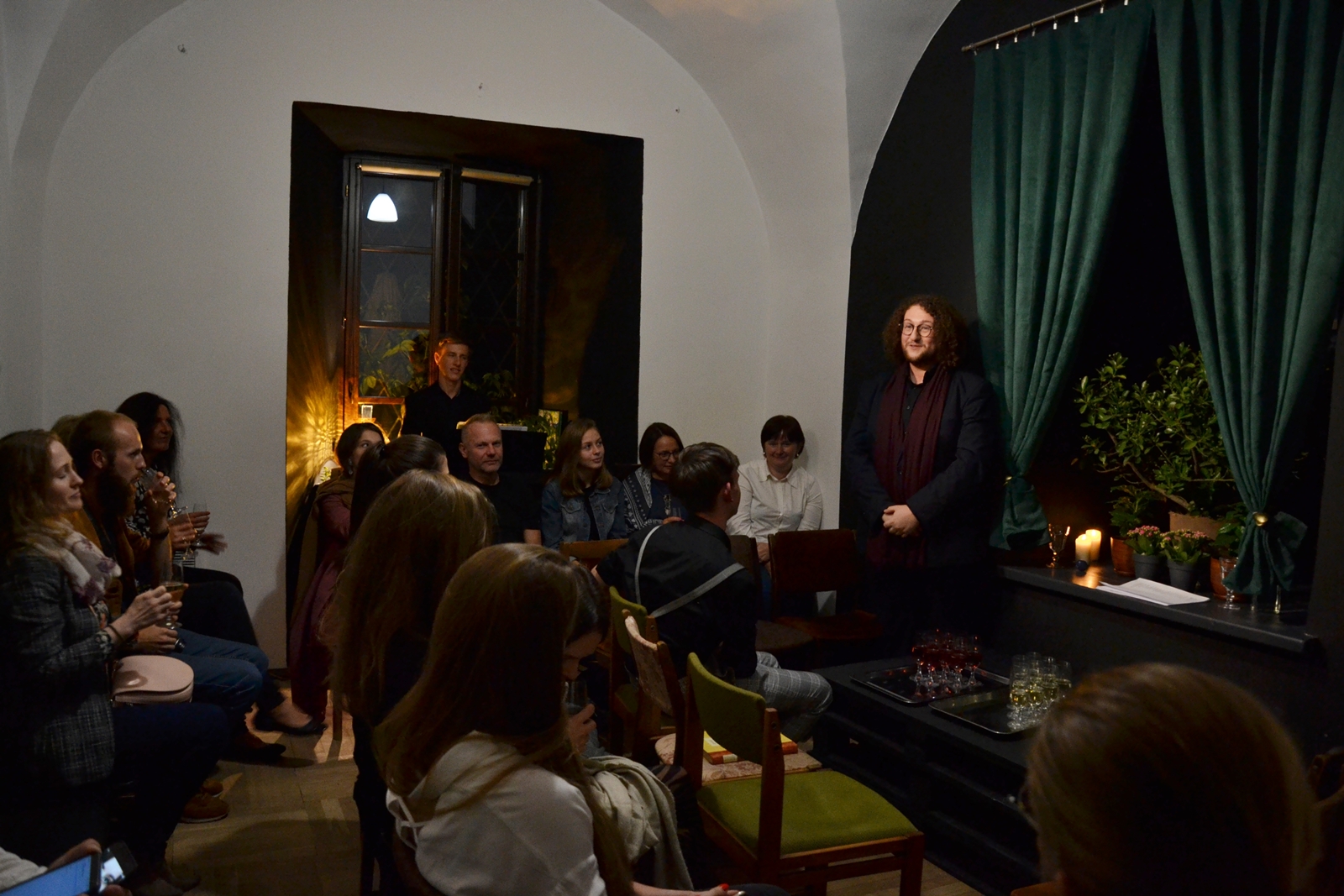 Pod dużym oknem czarne palety, a na nich kolejni artyści. Wokół nich, blisko, na wyciągnięcie ręki, publiczność zajmująca różnorodne krzesła, oświetlona przytłumionym światłem lamp i świec. Ściany w klasycznym połączeniu czerni i bieli, na parapetach ustawione z dbałością rośliny, a za oknami dziki bluszcz. Lecz choć miejsce to może oczarować gości swoją kameralną atmosferą, nawet najprzyjemniejsze wnętrze nie zapewniłoby sukcesu, gdyby nie tworzący je ludzie. W tym wypadku młodzi, utalentowani, pełni pasji, jednak, co najważniejsze, otwarci na świat i na innych, serdeczni i pełni ciepła. Publiczność powitał prezes Fundacji, Dawid Mik, jednocześnie wokalista zespołu Szpetni, który jako pierwszy wystąpił tego wieczoru na Najmniejszej Scenie Świata, prezentując, mniej i bardziej już znane widzom, utwory ze swojego repertuaru. Skupione były one wokół tekstów Agnieszki Osieckiej, Jeremiego Przybory, a także, choć nie uwzględniał ich początkowy plan, Wojciecha Młynarskiego. Nie obeszło się oczywiście bez pomyłek i zaskoczeń, które czujna publiczność w mig wychwytywała, mimo że Filip Kot, druga połowa zespołu, nieco skrył się przed jej spojrzeniami. Niemniej zarówno duet ten, jak i jego drobne potknięcia, mają w sobie tyle naturalności i uroku, że zawsze wywołują uśmiechy na twarzach widzów. I nie przesadzi ten, kto powie, że atmosfera była niemal rodzinna, o czym świadczyć może ochocze dołączenie się publiczności do wspólnego śpiewania. Oprócz Szpetnych, na Najmniejszej Scenie Świata wystąpiła również Joanna Kurek z utworem W dziką jabłoń cię zaklęłam, którego tekst także jest autorstwa Agnieszki Osieckiej. Nie było jednak wyłącznie muzycznie, bowiem pomiędzy piosenkami Szymon Szczęch i Kacper Rokosz odczytali niektóre z listów, które pisali do siebie Agnieszka Osiecka i Jeremi Przybora. Na krótkie momenty porywali oni słuchaczy do świata pełnego namiętności, zachwytu drugim człowiekiem, ale też przyjaźni i oddania. Publiczność mogła więc przekonać się sama, że Osiecką i Przyborę łączyła niezwykła relacja, o czym Dawid zapewnił już na początku, uzasadniając wybór tych właśnie twórców. I choć teksty piosenek oraz listy próbowały sprawić, by był to jeden z tych tęsknych wieczorów, kiedy myśli człowieka uciekają w jemu tylko znanym kierunku, nastrój był jednak bardziej radosny, pełen uniesień, zachwytów, ale i wdzięczności. I widzowie, zapytani przy winie i poczęstunku o to, jak jeszcze można by ulepszyć Najmniejszą Scenę Świata, rozłożyli z bezradnością ręce. Z entuzjazmem natomiast wyrażali pochwały i fotografowali się na tej małej scenie złożonej z palet. Tak niezwykłej może, bo dostępnej dla każdego.