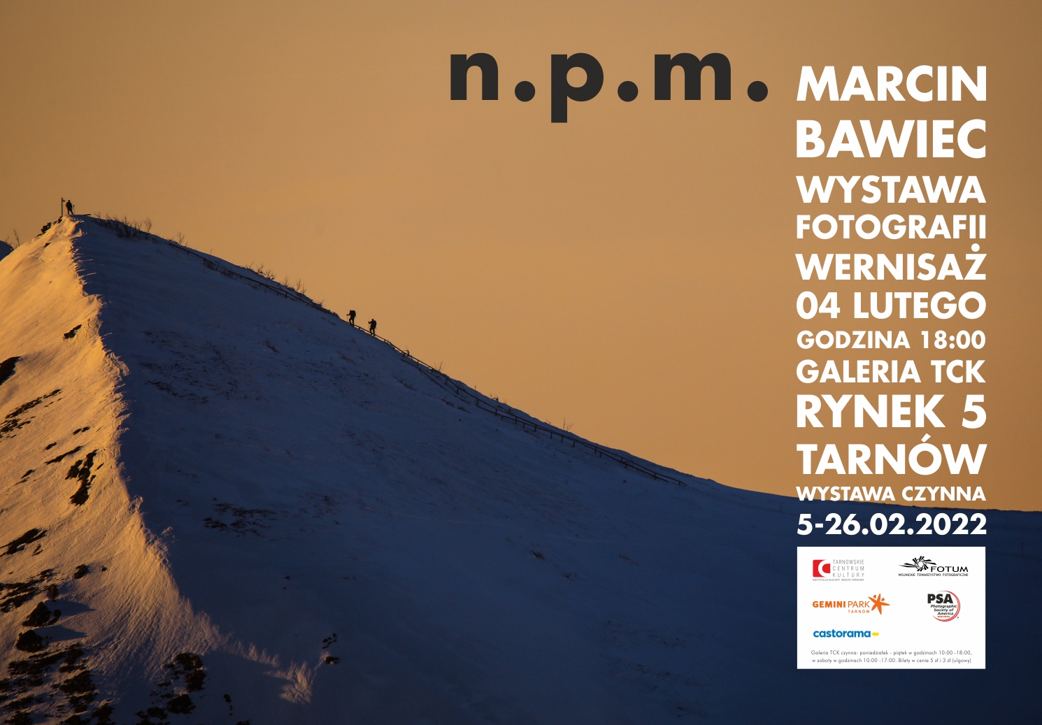 Wystawa fotografii zatytułowana n.p.m., stanowi cykl 80 prac wykonanych w trakcie wielu wypraw będących realizacją pasji podróżniczej. Widz odnajdzie tu krajobraz górski, fotografie kolorowe oraz monochromatyczne. Fotografie na wystawie pochodzą z wielu różnych wypraw, najstarsze zdjęcie pochodzi z 2015 roku, ale są też Bieszczady ze stycznia tego roku.