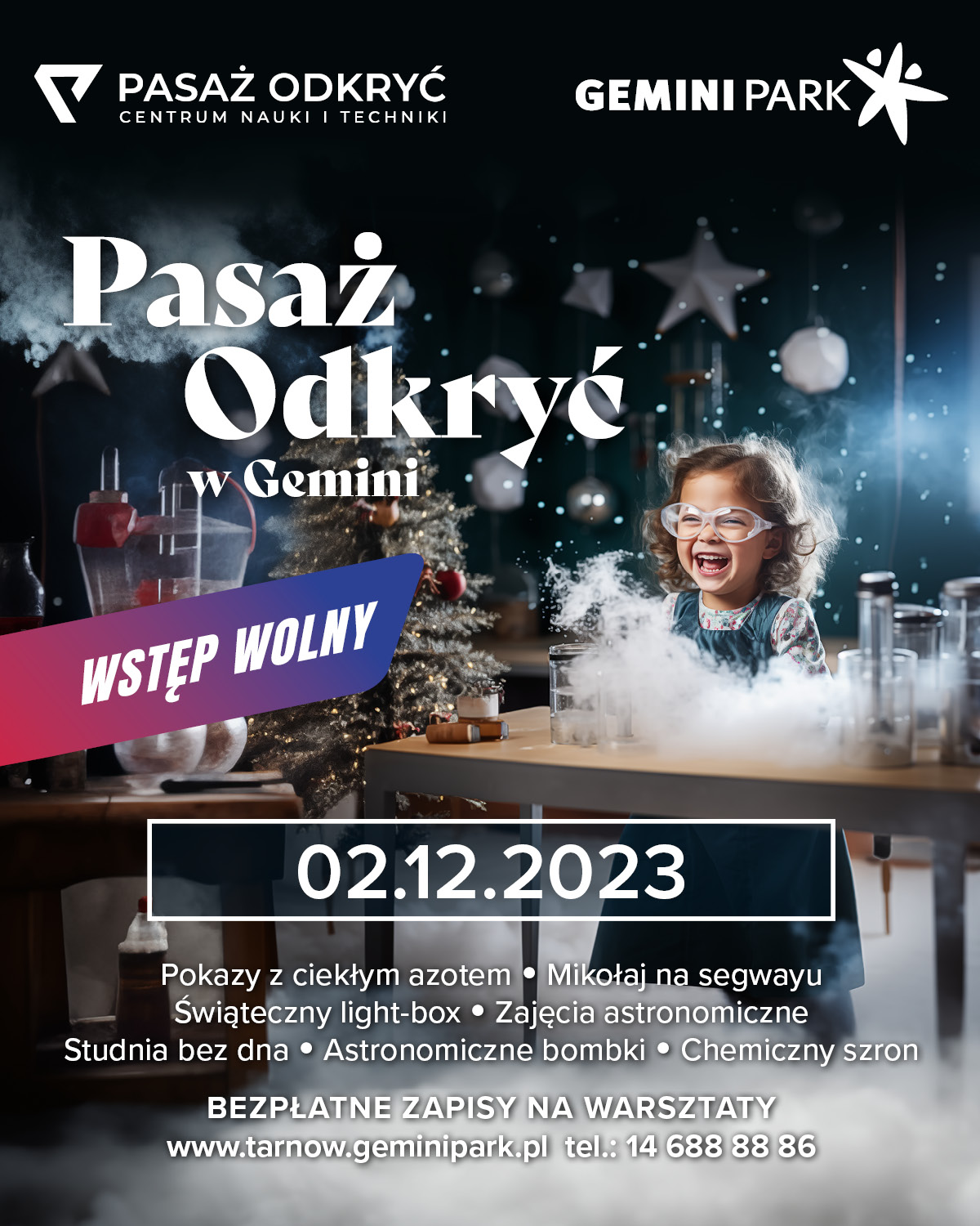 Nadchodzi sobota pełna magicznych atrakcji dla całej rodziny! Gemini Park Tarnów wraz z Tarnowskim Pasażem Odkryć zaprasza na wyjątkowe spotkanie, podczas którego nauka połączy się z magiczną zabawą, a wszystko to odbędzie się w świątecznym klimacie!