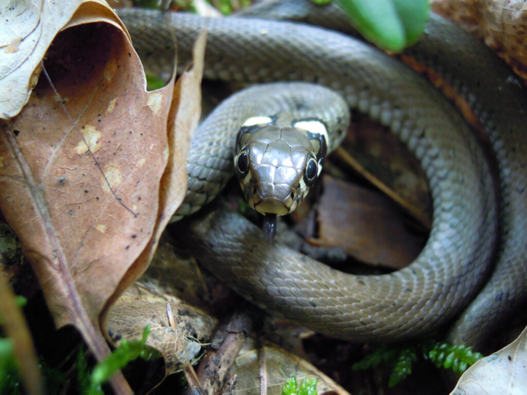 Zaskroniec zwyczajny jest duży i okazały. Samica mierzyć może nawet półtora metra i jest większa od samca (Znowu! Pamiętacie modliszkę i tygrzyka? Jaka ta natura mądra…). Ubarwienie tego węża z rodziny połozowatych jest tak charakterystyczne, że nie sposób go pomylić z jakimkolwiek innym u nas występującym (a nie ma ich wiele, raptem pięć gatunków…). Właśnie od tych rzucających się w oczy jasnych plam “za skroniami” pochodzi jego polska nazwa. Widać je zresztą wyraźnie na zrobionych przez mnie zdjęciach. Funkcja makro w aparacie to świetna rzecz… I ciekawostka – choć ubarwienie zaskrońca jest zwykle szarawe, czasem z małymi ciemniejszymi cętkami, w Bieszczadach możemy natknąć się na formę melanistyczną tego gatunku, całą czarną, pozbawioną nawet typowych plam. Szkoda, że choć tak niewinny i łatwy do rozpoznania, zaskroniec często pada ofiarą turystów, ogrodników, spacerowiczów i działkowiczów, dla których każdy wąż, to „straszliwa żmija”, więc zabijają wszystko, co pełza… Warto pamiętać, zanim wpadniemy w histerię, że wszystkie węże na terenie naszego kraju są pod ochroną! Nawet ta „straszna żmija”, która, jak już wspomniałam, wcale nie jest groźna…