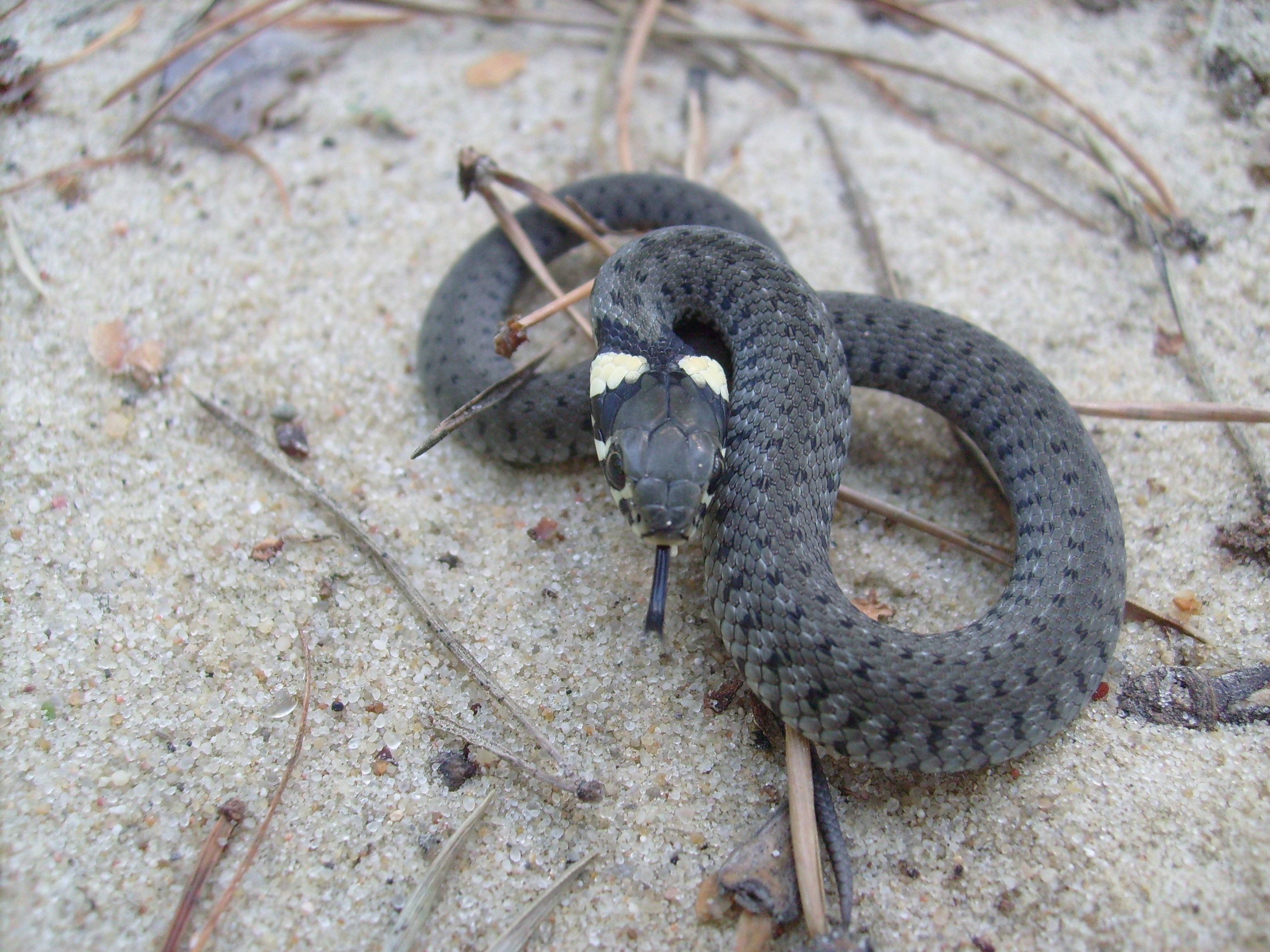 Ale wróćmy do rzeczy. Teraz, właśnie w sierpniu i wrześniu, przychodzą na świat młode zaskrońce. Wylęgają się z jaj złożonych przez samicę dwa miesiące wcześniej, w liczbie od 9 do 40. Małe, jak ołówek, ale już samodzielne! Jak są małe, łatwo zrozumieć – spójrzcie na zdjęcie, na którym taki sierpniowy malec leży na piasku obok sosnowych igieł, niewiele mniejszych od niego. Ten zaskrońcowy niemowlak bardzo był ciekaw aparatu. Ładnie pozował, ale kiedy zanadto się zbliżyłam, „pogroził” mi, otwierając swoją maleńką paszczkę i sycząc głośno. Zwykle jednak zaskroniec ucieka na widok człowieka, możemy więc mówić o dużym szczęściu, jeśli uda nam się zrobić mu zdjęcie z bliska.